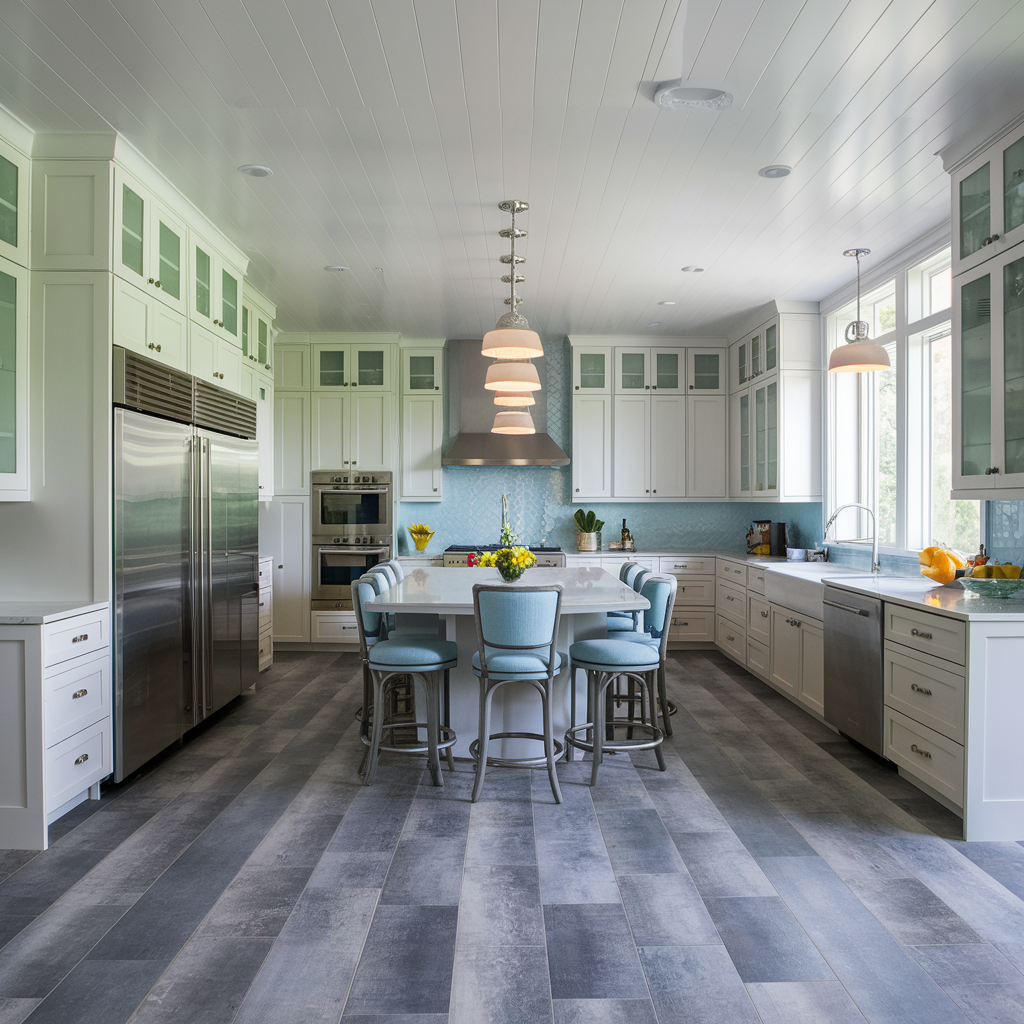 However, in kitchen design color choices gravitate toward gray floors which provide a clean and modern foundation that fits in well with most of the styles. Be it your kitchen featuring white cabinets or you opt for a more colorful style, gray floors serve as the element that brings the design together in a uniform manner. They function best as finishes for the kitchen’s juxtaposition of neutral, natural materials and the glass. They are a shiny solution to the problem of a high-traffic surface which frequently requires repair and cleaning work.