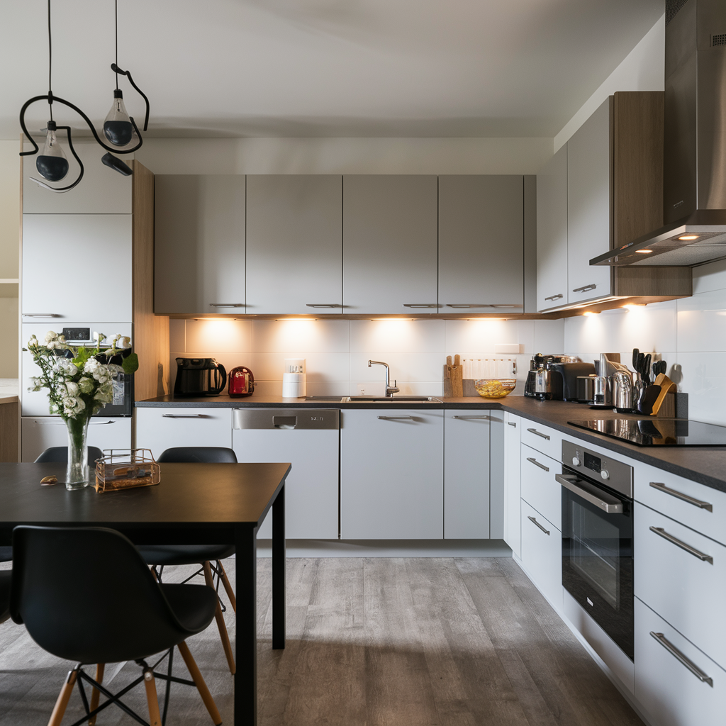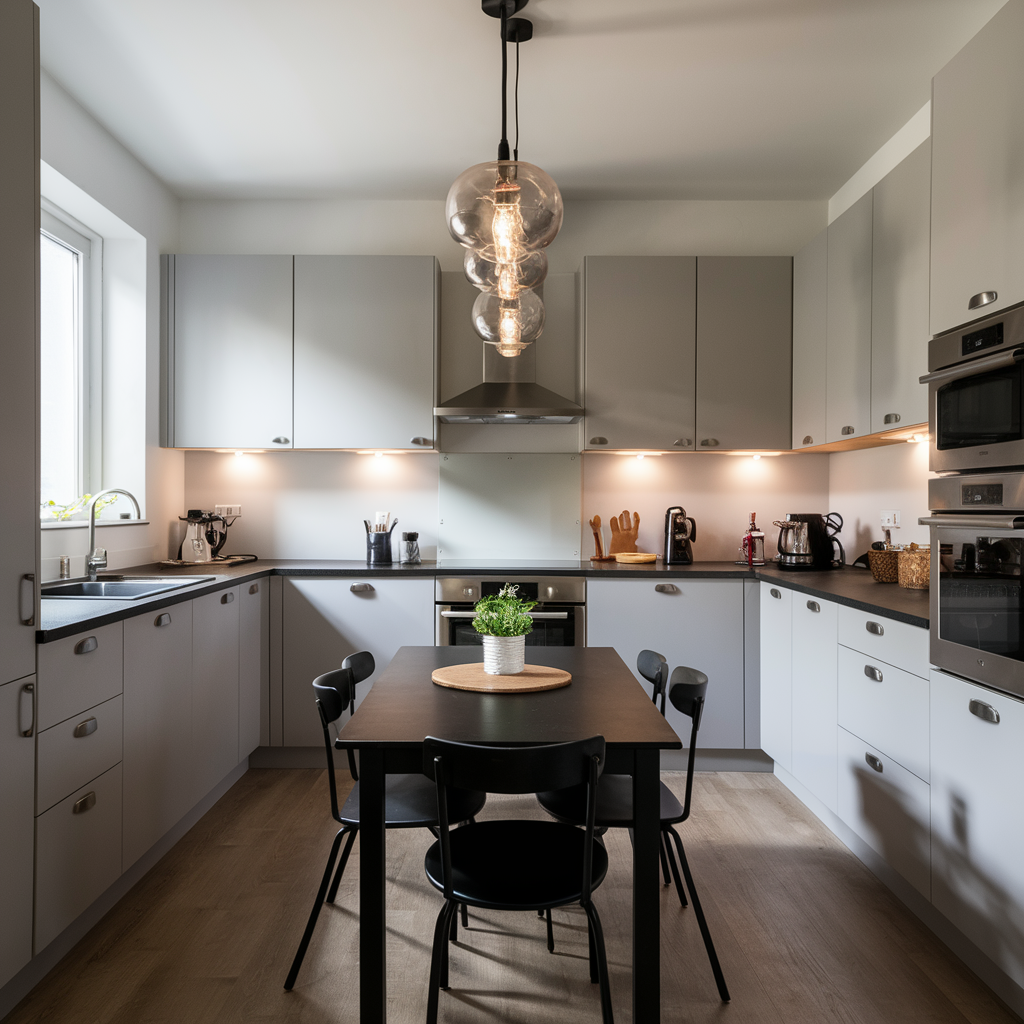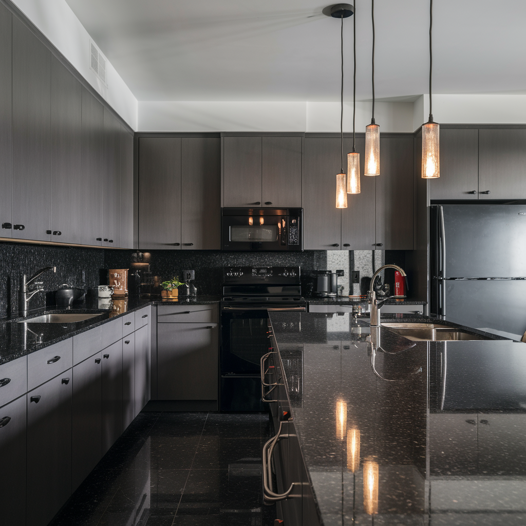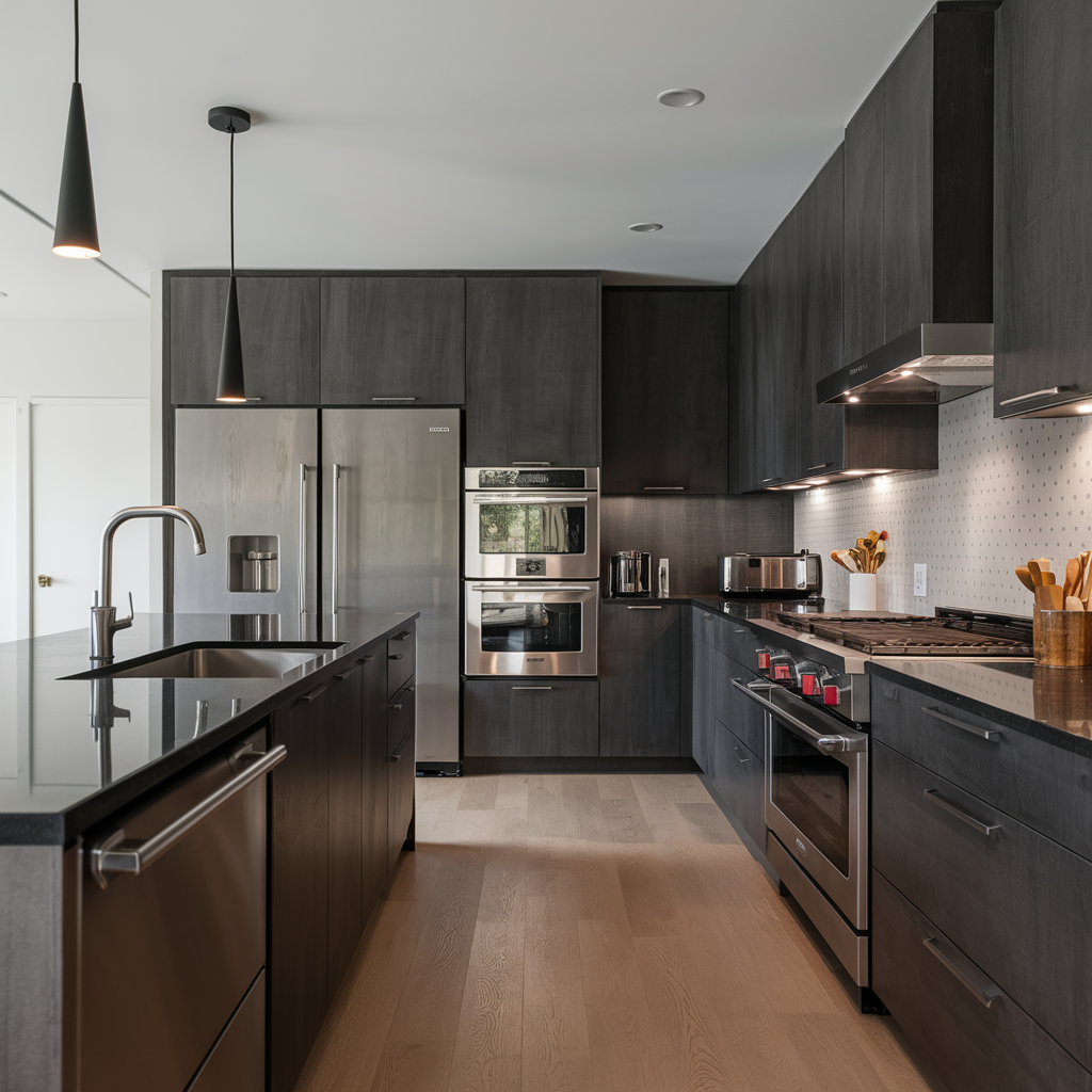 Mixing black and gray in your kitchen space is a way to make your interior look different and newer. Suggestions on black and gray kitchen plans often include utilizing black countertops, appliances, or decorations paired with gray cabinets on the walls. The chromatic composition presents a sense of elegance and modernism.