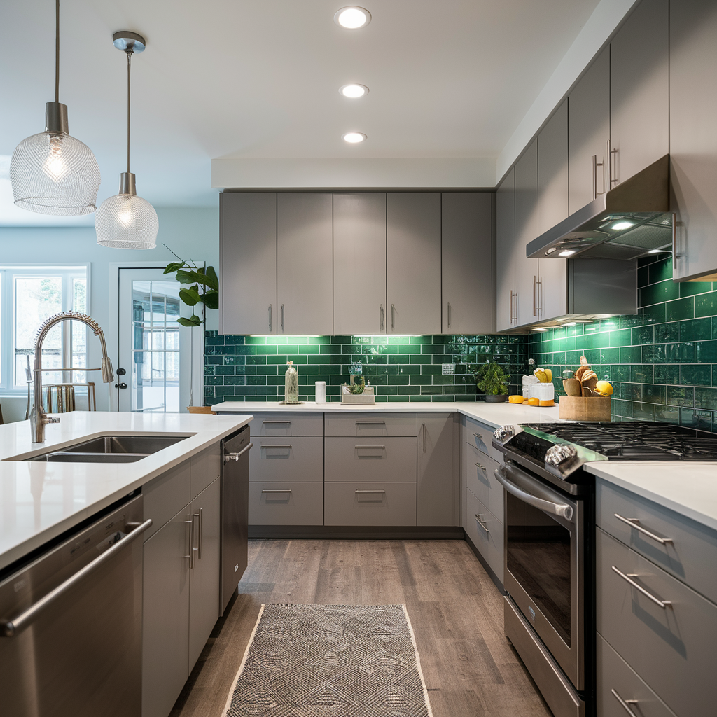 Acknowledging green factors to a gray kitchen will definitely make your space look fresh and eco-conscious. Not only should your kitchen execute this, but it can also use the color scheme by having the green thyme wallpaper as the backdrop paint on the whole kitchen wall. With either the decoration of green backsplash tiles, decorative, or even planting green plants into the color scheme; gray must be formally complemented with green elements; this configuration will ensure that the design presents a dynamic and modern atmosphere.
