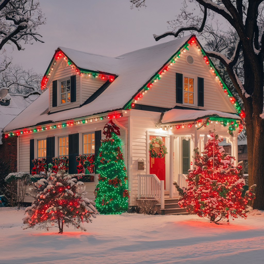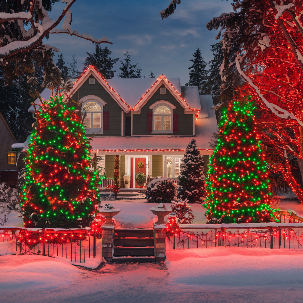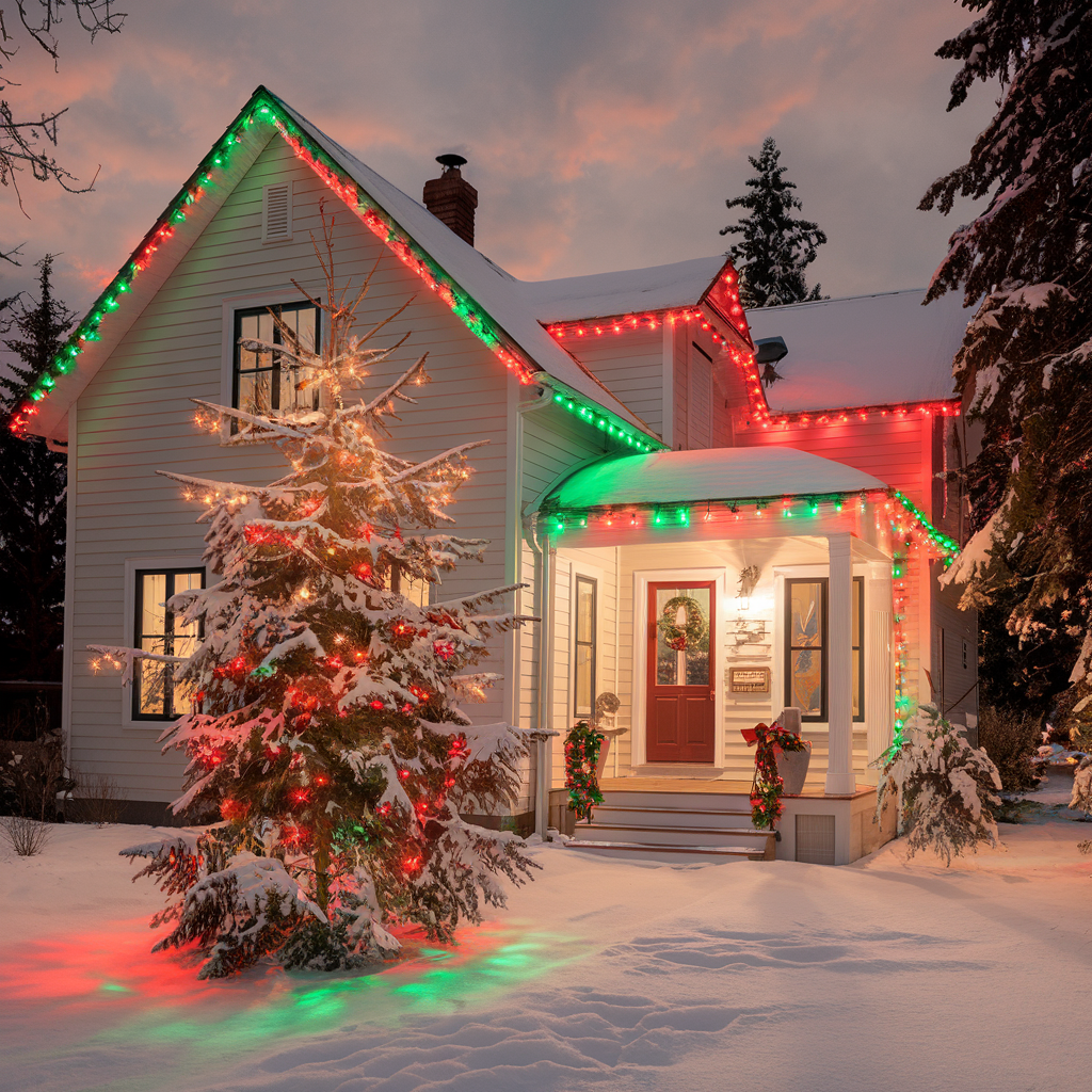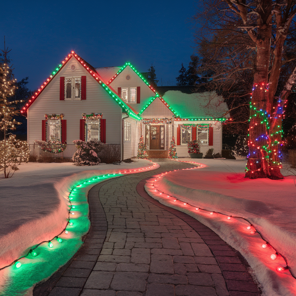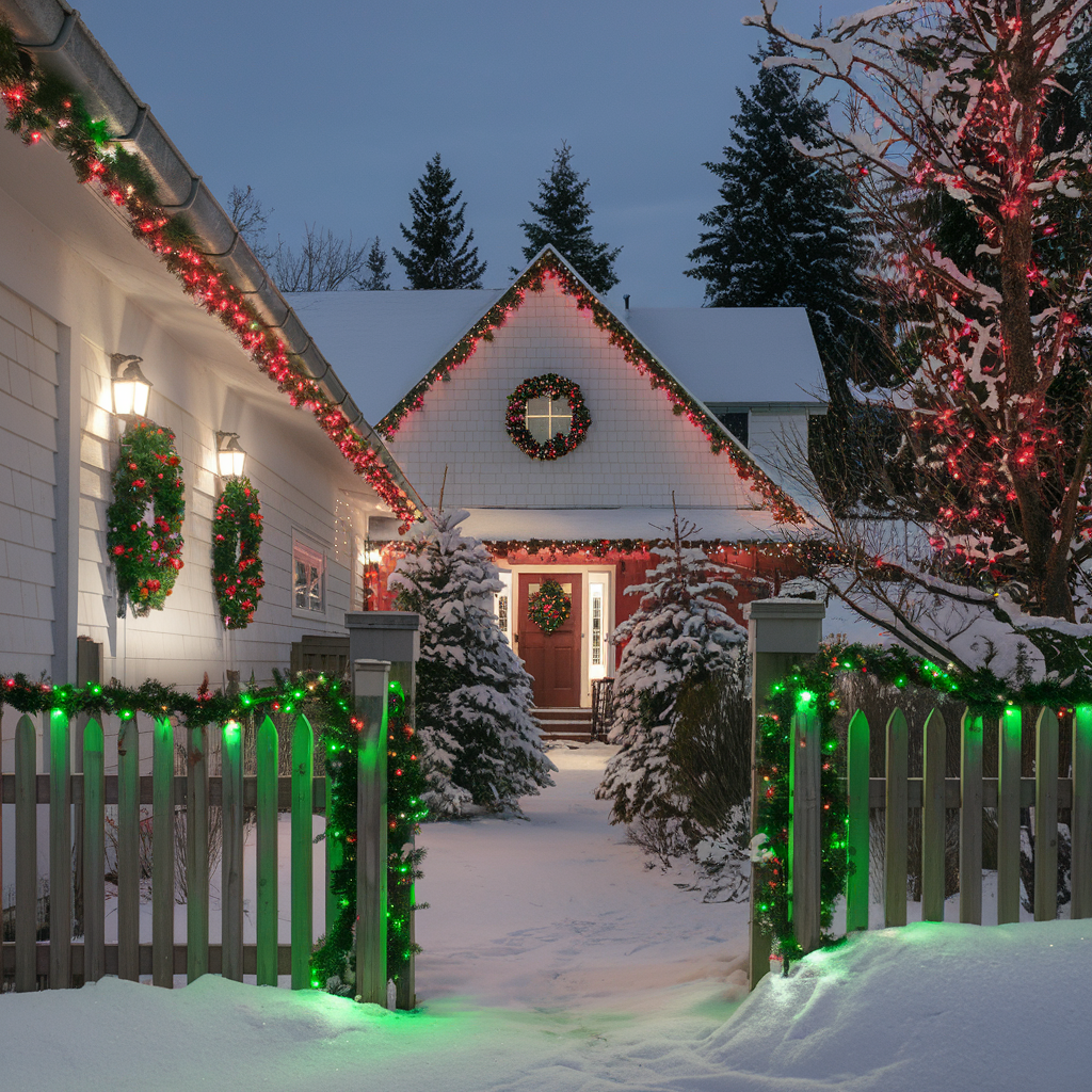 Bring the spirit of the holidays into your living space with a combination of green Christmas lights for the house and red Christmas lights outside. It is a color combination that is perfect for creating a cozy and inviting environment in cottage-style homes. Outfit the roofline and windows with a green Christmas lights house exterior, which will resemble the natural look of evergreen garlands. Decorate the outside area with red Christmas lights, placing them around the doorposts and along the porch so as to give a bright touch of festive color. The gentle glow of these lights will remind us of the comforting atmosphere of the past and thus, your home will be the best choice for the season.