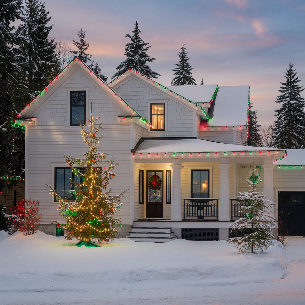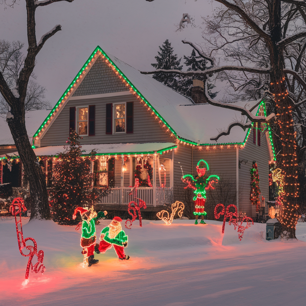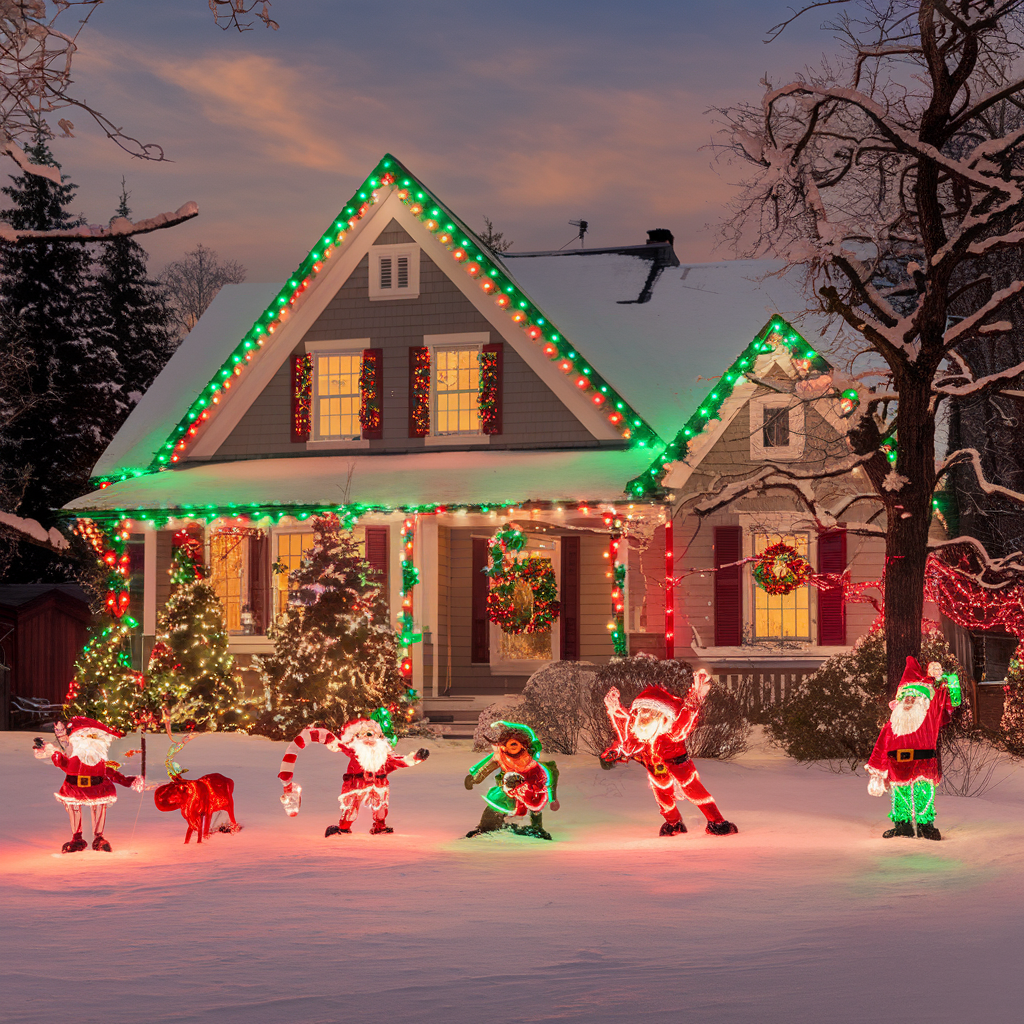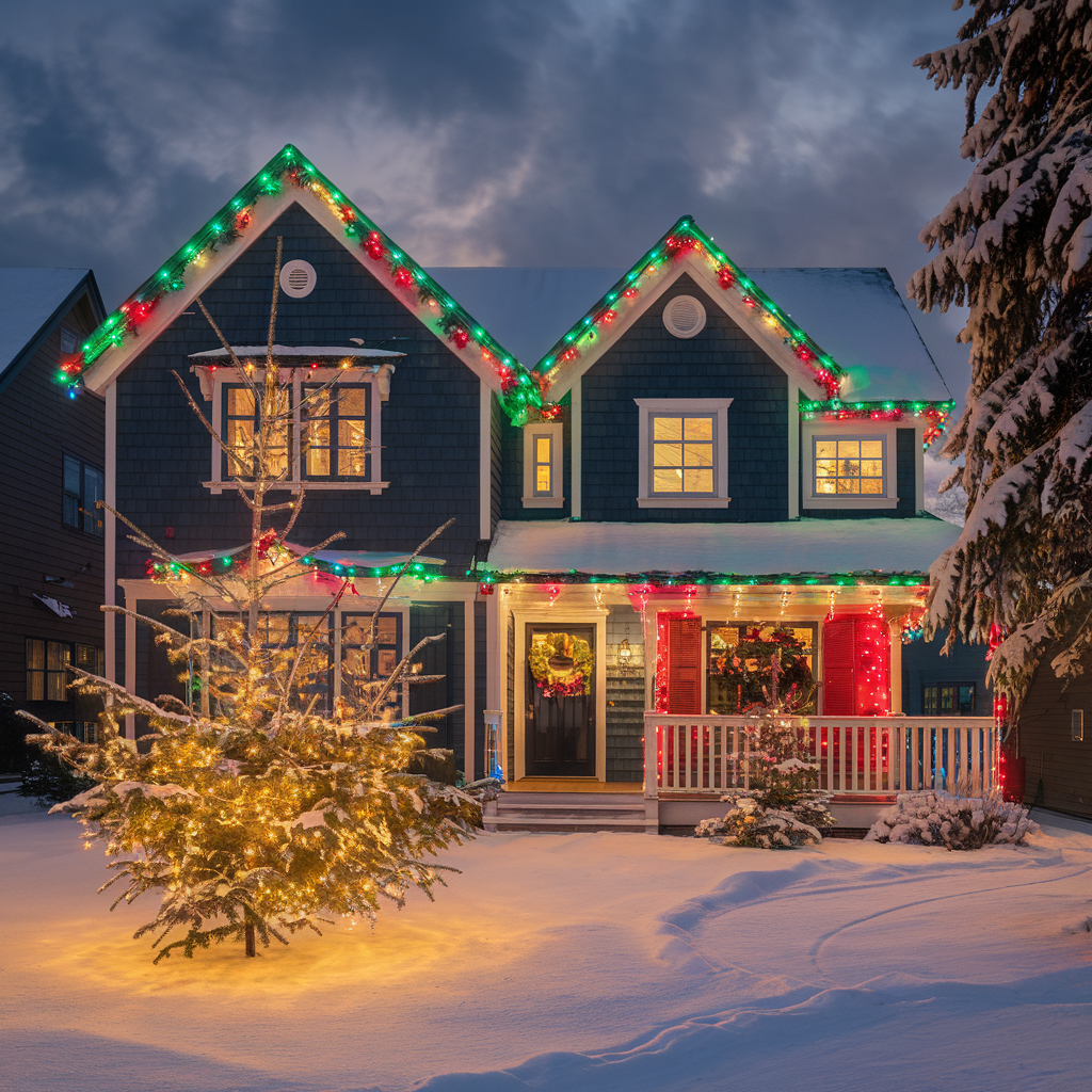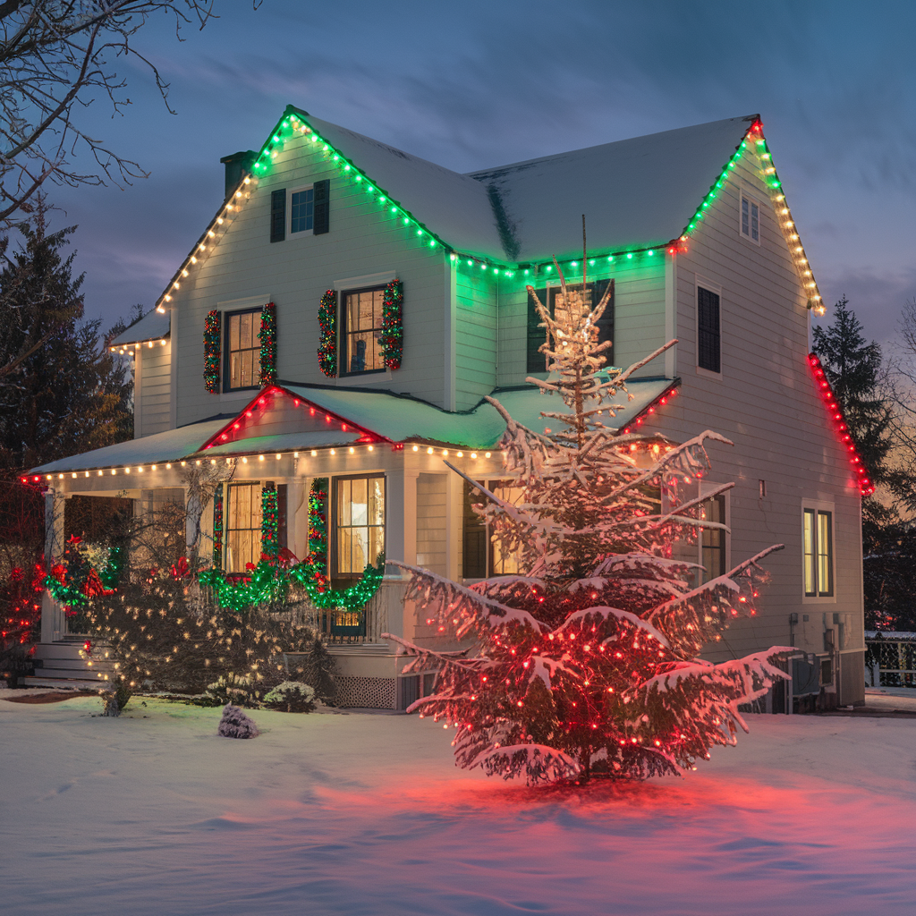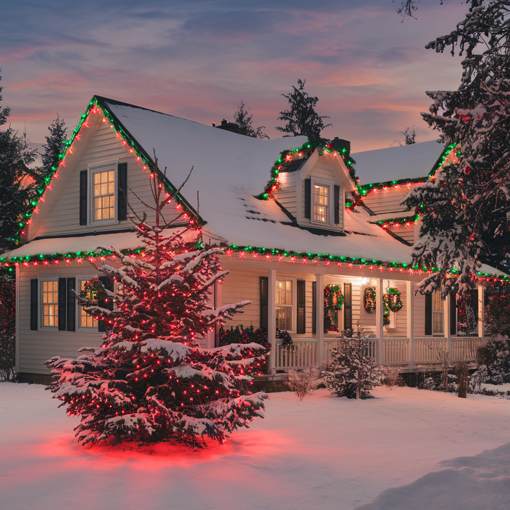 Bring the spirit of the holidays into your living space with a combination of green Christmas lights for the house and red Christmas lights outside. It is a color combination that is perfect for creating a cozy and inviting environment in cottage-style homes. Outfit the roofline and windows with a green Christmas lights house exterior, which will resemble the natural look of evergreen garlands. Decorate the outside area with red Christmas lights, placing them around the doorposts and along the porch so as to give a bright touch of festive color. The gentle glow of these lights will remind us of the comforting atmosphere of the past and thus, your home will be the best choice for the season.