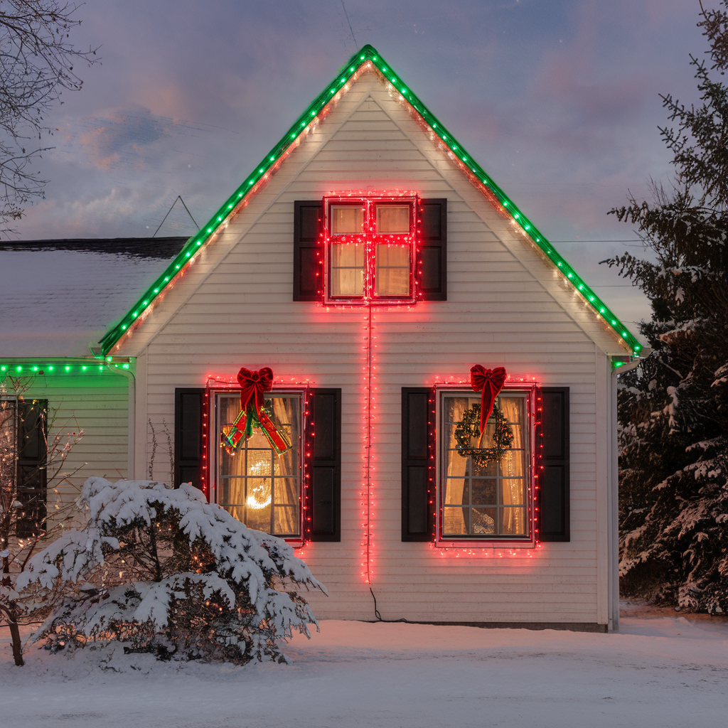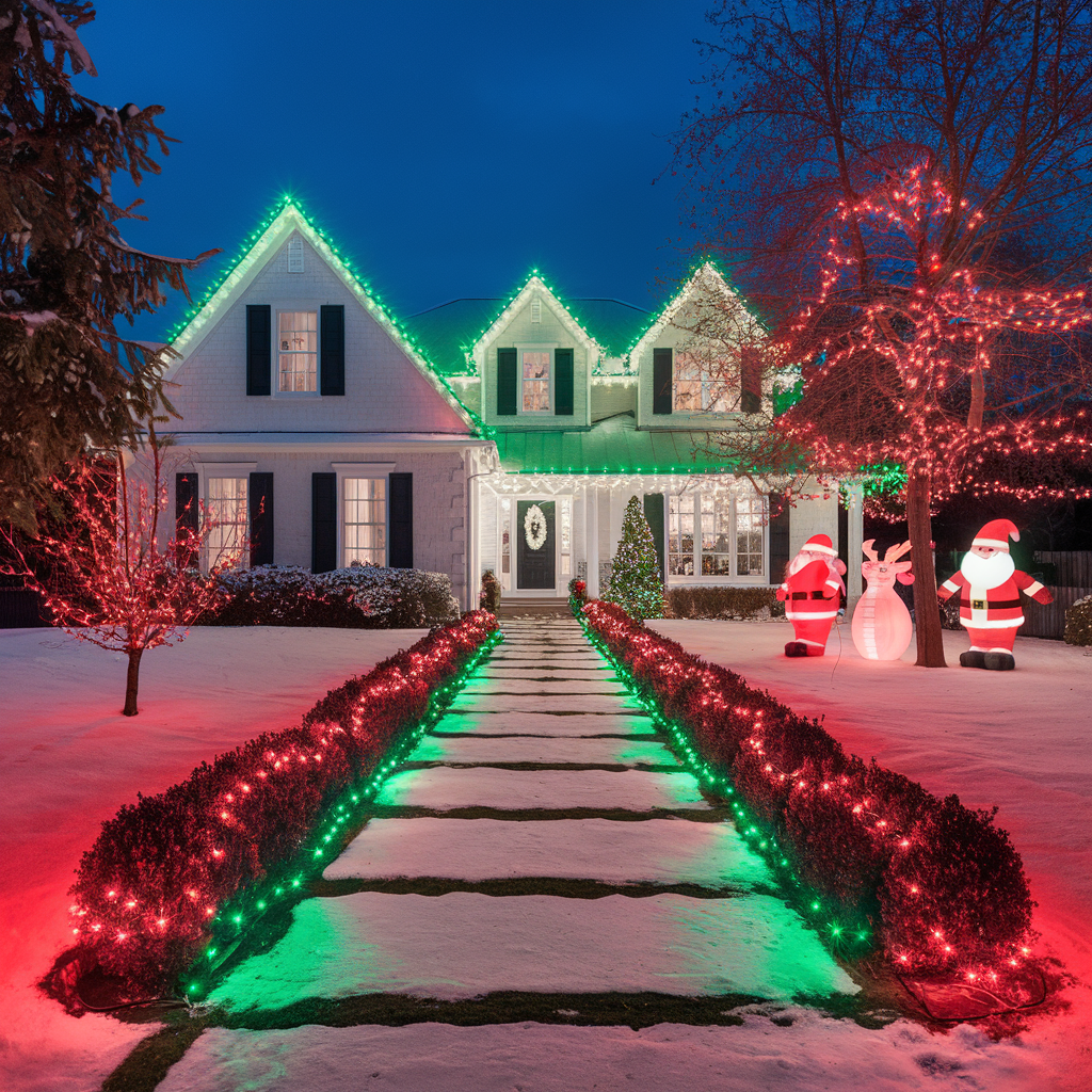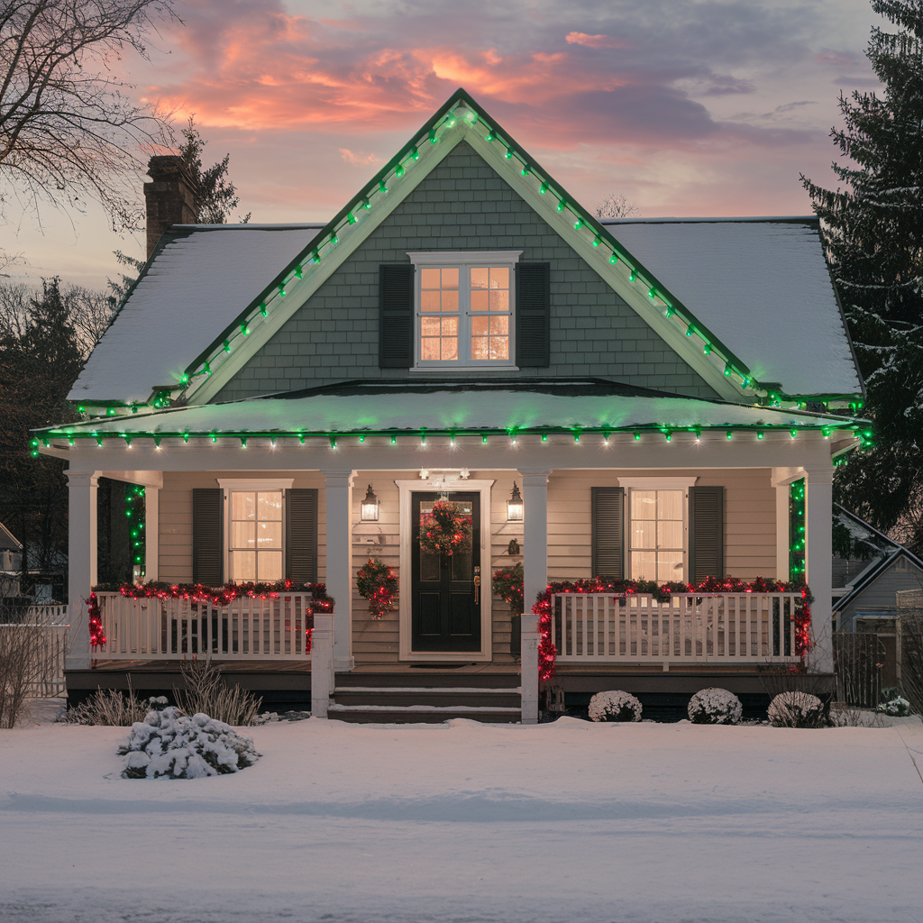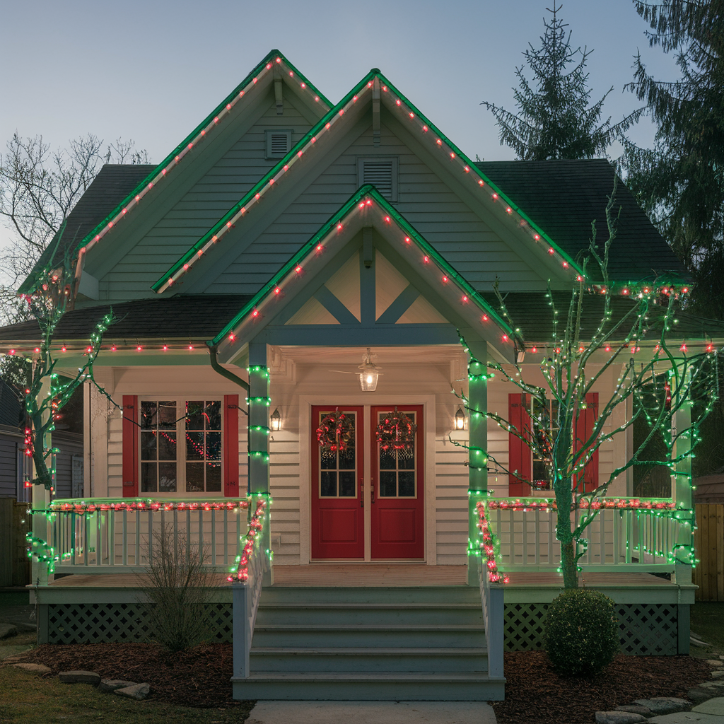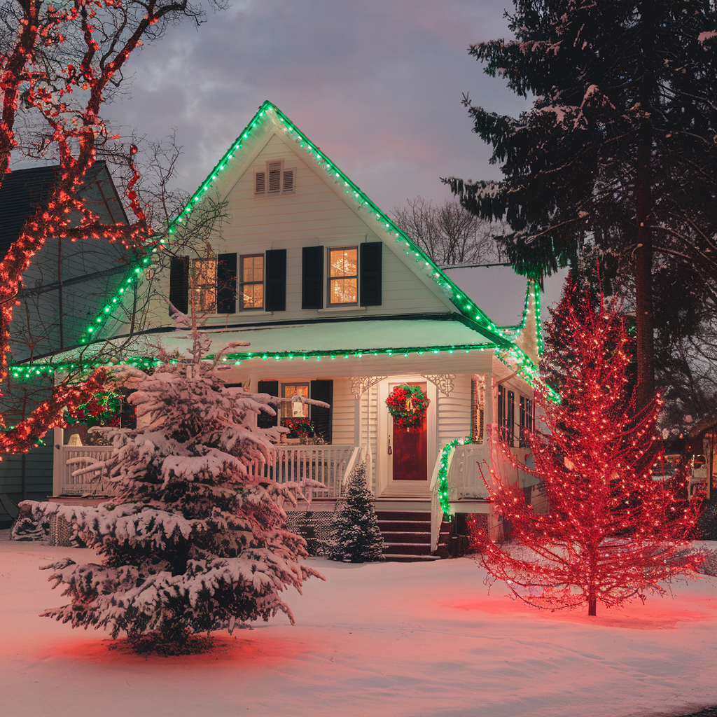 The mix of green Christmas lights on house with red Christmas lights makes the timeless and festive mood that is perfect for traditional Christmas decor. By using green Christmas lights on the exterior of the house and red Christmas lights outdoors, one can not only make the holiday season warm and welcoming but also resonate with classic Christmas themes. The bright green and red hues against the winter background become the perfect contrast and make your home stand out among the others in the neighborhood. Thus, you can achieve the traditional style by outlining your roofline and windows with these lights, adding wreaths with matching ribbons, and putting large, illuminated ornaments on your front porch.