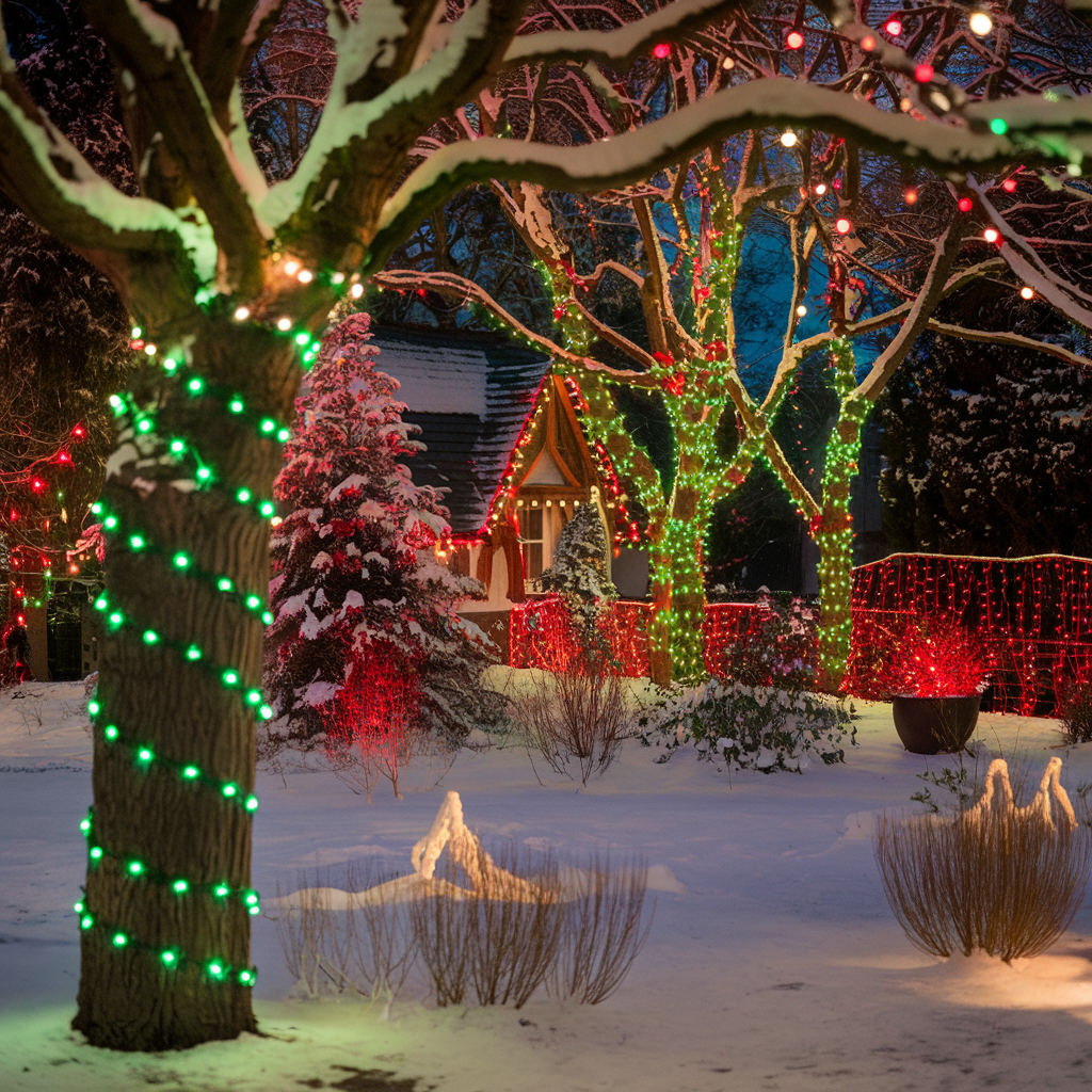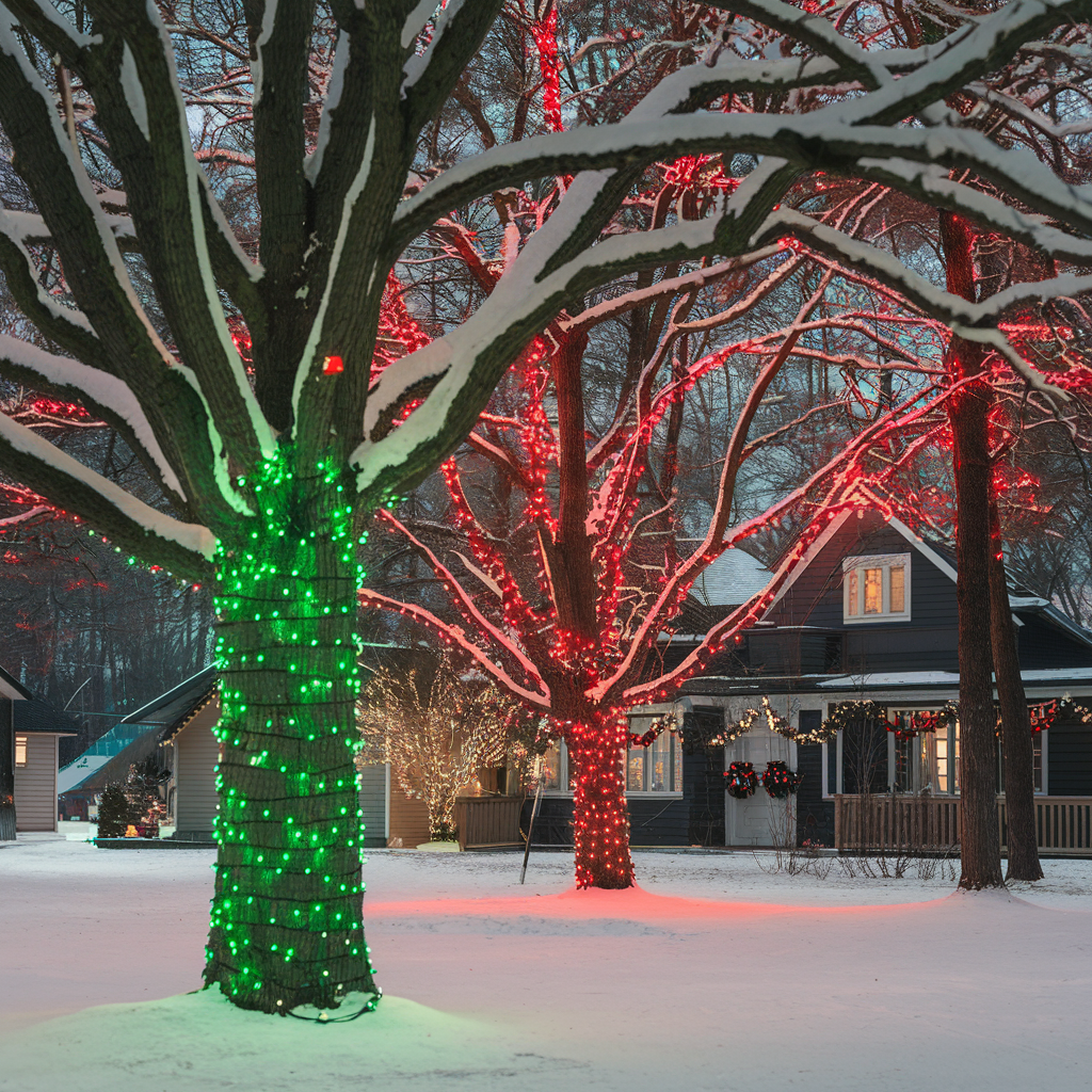 Decorating Outdoor Trees with Green and Red Christmas Lights