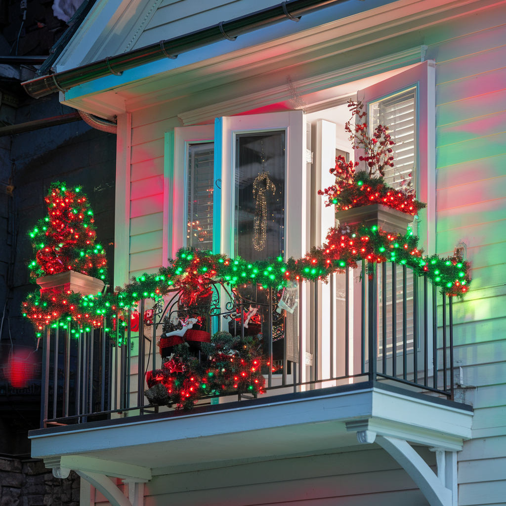 Make your balcony come to life with the green Christmas lights outdoor and red Christmas lights on the house exterior. Start the decoration by winding the green lights around the balcony railing and add the red lights to create figures or designs that are eye-catching from the street. You can also bring in some more décor like ornaments, bows, or even small potted Christmas trees with lights of similar colors. In this case, your balcony will become the center of attention and at the same time, the splash of color you add will be a standout exterior feature of your house in the neighborhood throughout the holiday season.
