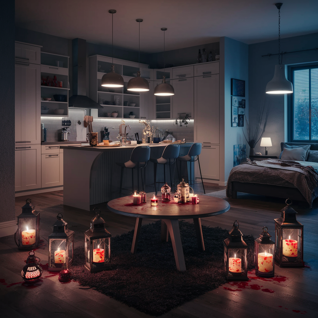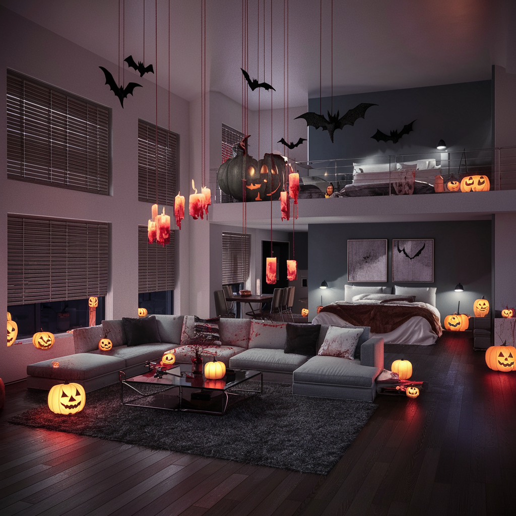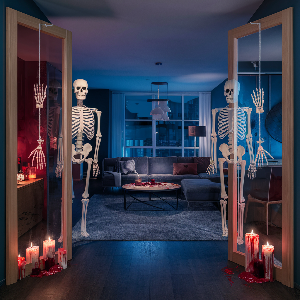 Skeletons are a Halloween classic that can be utilized creatively all through your apartment. You can put a life-sized skeleton on the sofa or at the dining table so they can be surprised in a spooky way. Hang skeleton hands from door frames or have skeleton figures climbing up the walls. Candles with the red “blood” dripping from them can add more to the diabolical atmosphere. This concept may be implemented in all rooms, from the living room to the bedroom, thus ensuring that the apartment is prepared for Halloween.