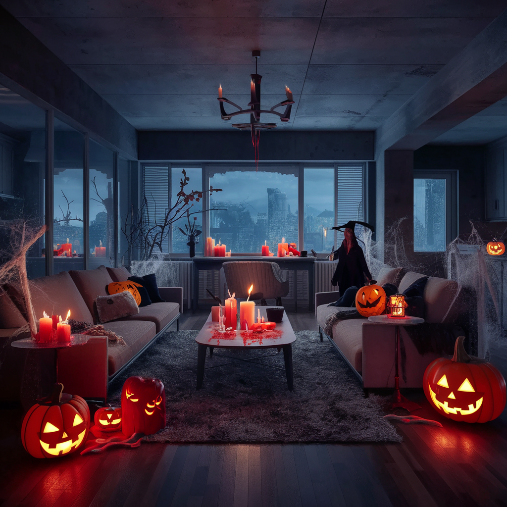 Turn your flat into a dark and spooky place with Gothic-influenced decor. Use elements such as black candles, vintage candelabras, and velvet drapes in deep, mood-colored tones. Incorporate the skulls of animals, spiders, and old dolls as decorative accents in order to strengthen the scary feeling. It suits well with any room from your bedroom to your living room, thus your apartment can be a luxurious yet frightful place that’s appropriate for Halloween.
