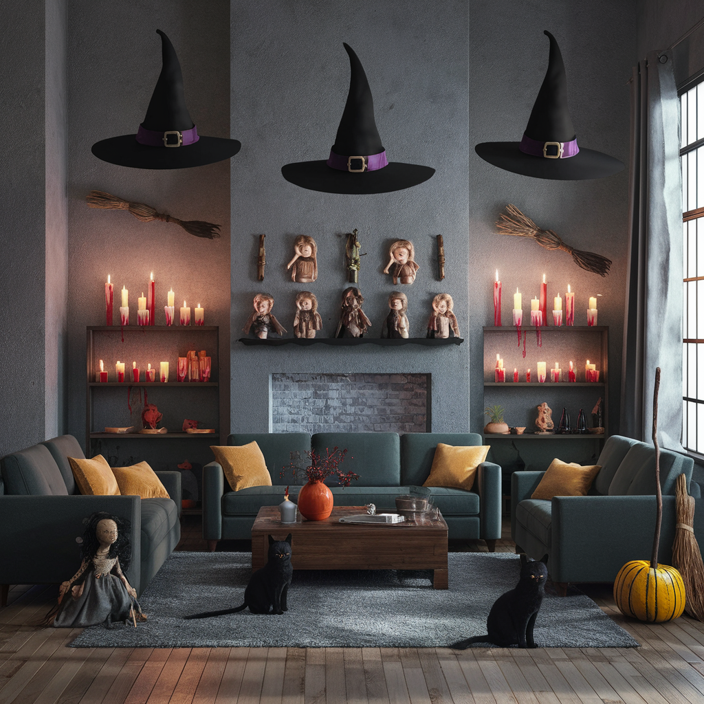 Adopt the mysterious powers of witches in your Halloween apartment decor. Immerse your living room with aged broomsticks resting on borders and candles of “blood” in crystal holders. Suspending witch hats from the ceiling with invisible thread is most artfully done, giving the impression that they are airborne. Insert black cats and antique dolls into the space to make it feel mysterious but should also be lit. Additionally, it is styled in a non-fancy witchy manner which sets both the autumn season and the spooky feel in the room.