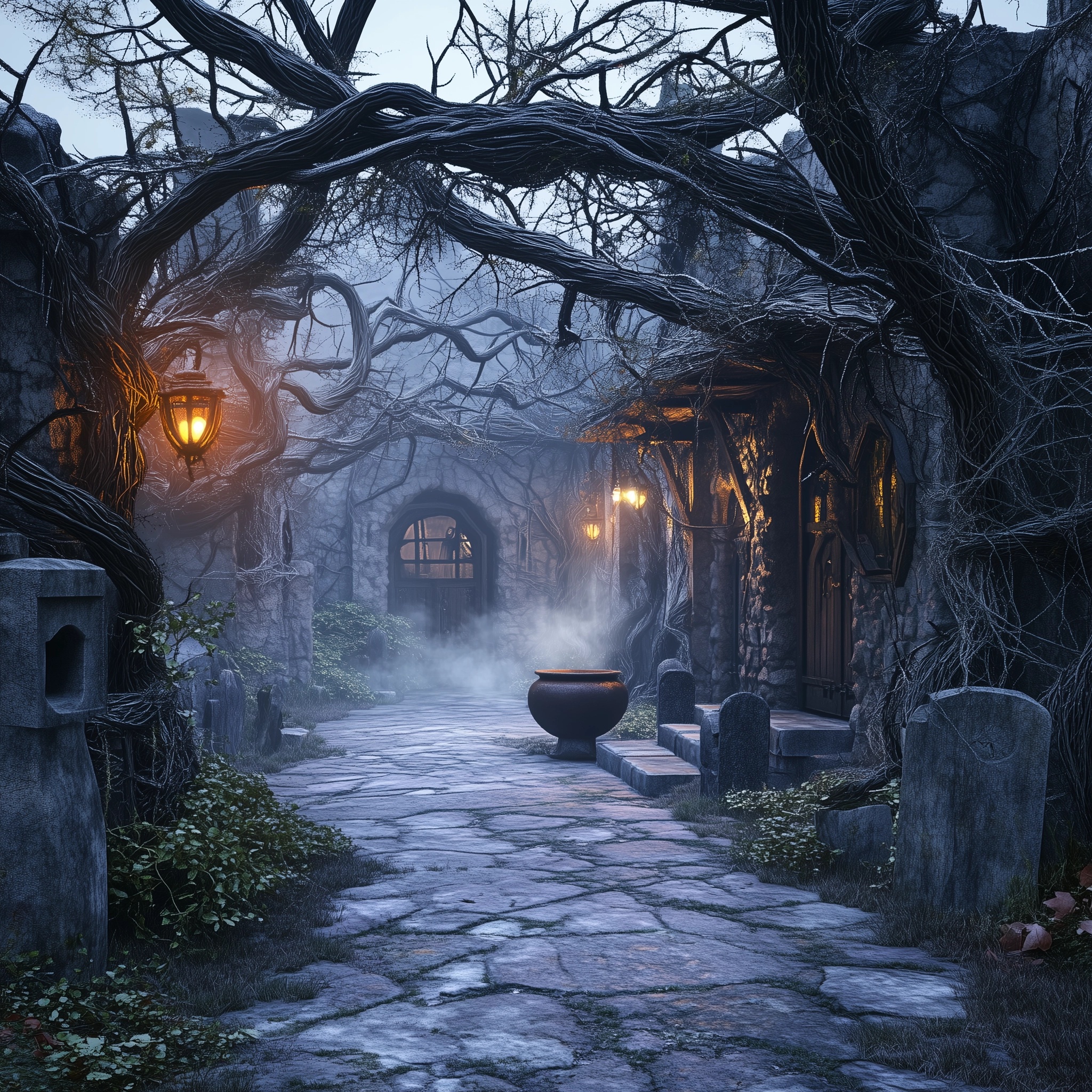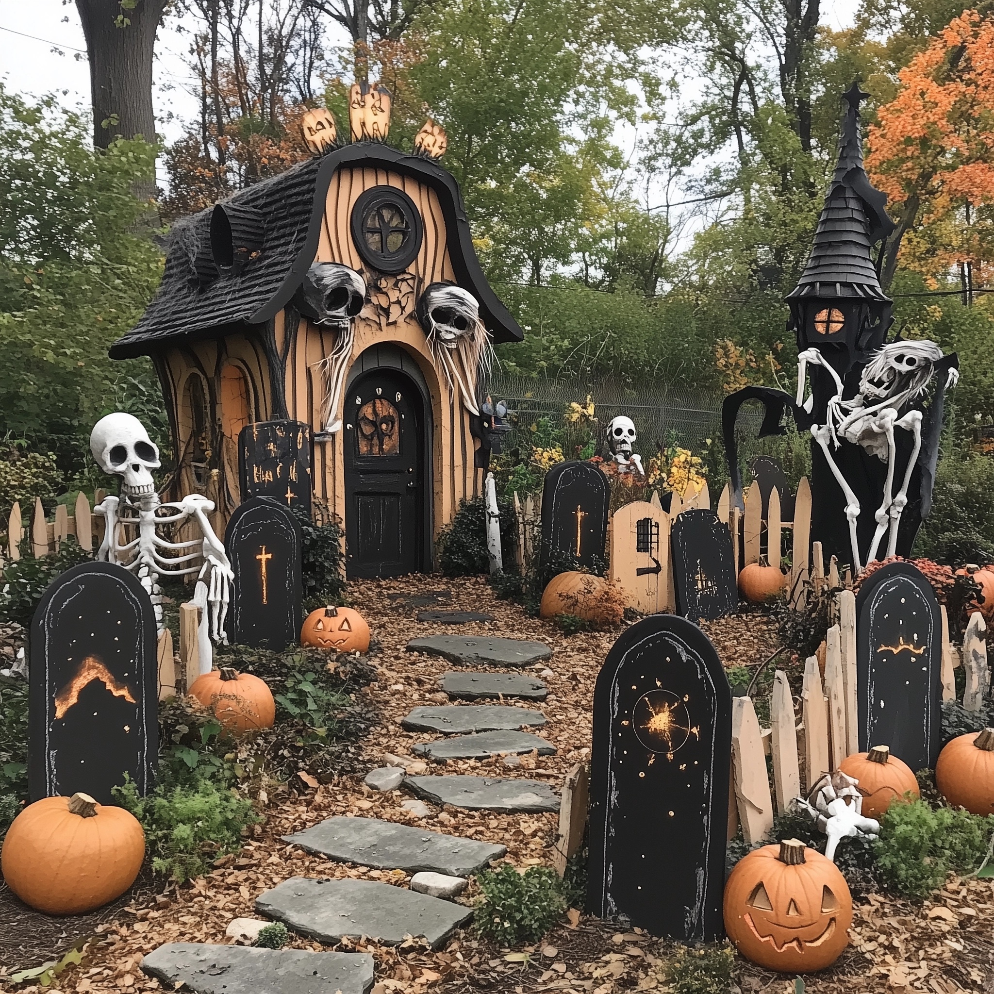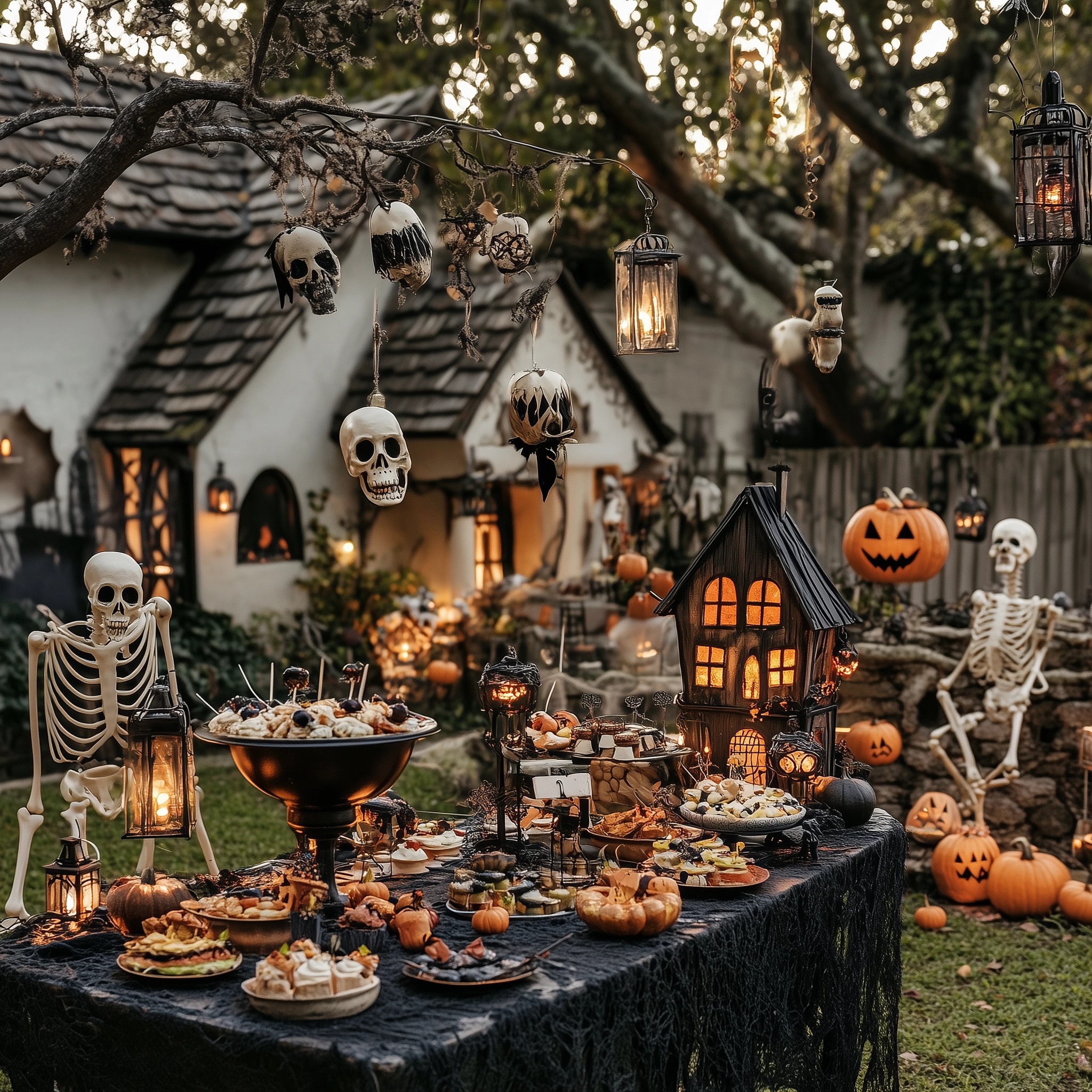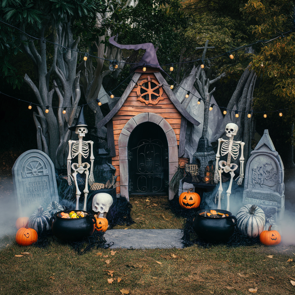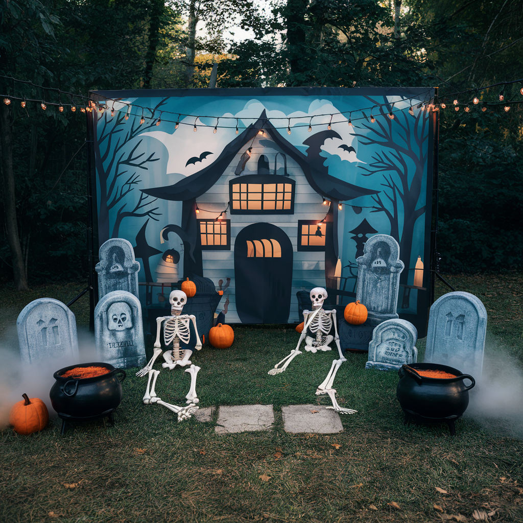 A Halloween photo booth is a great way to entertain guests and create lasting memories. Set up a spooky backdrop with tombstones, trees, and witch house elements. Include props like skeletons, cauldrons, and themed signs for guests to hold. String lights around the area to ensure it’s well-lit, and consider adding a fog machine to enhance the eerie atmosphere.