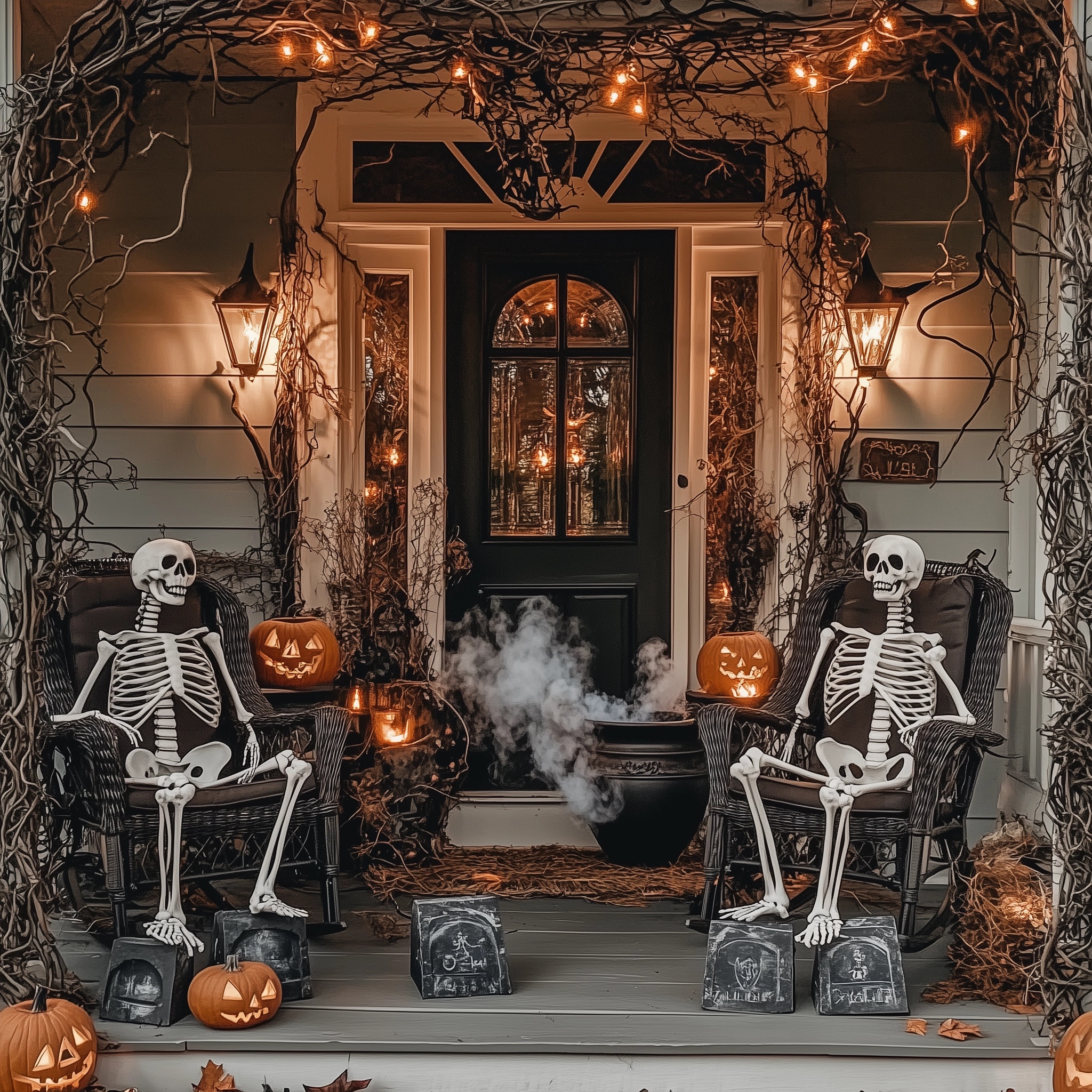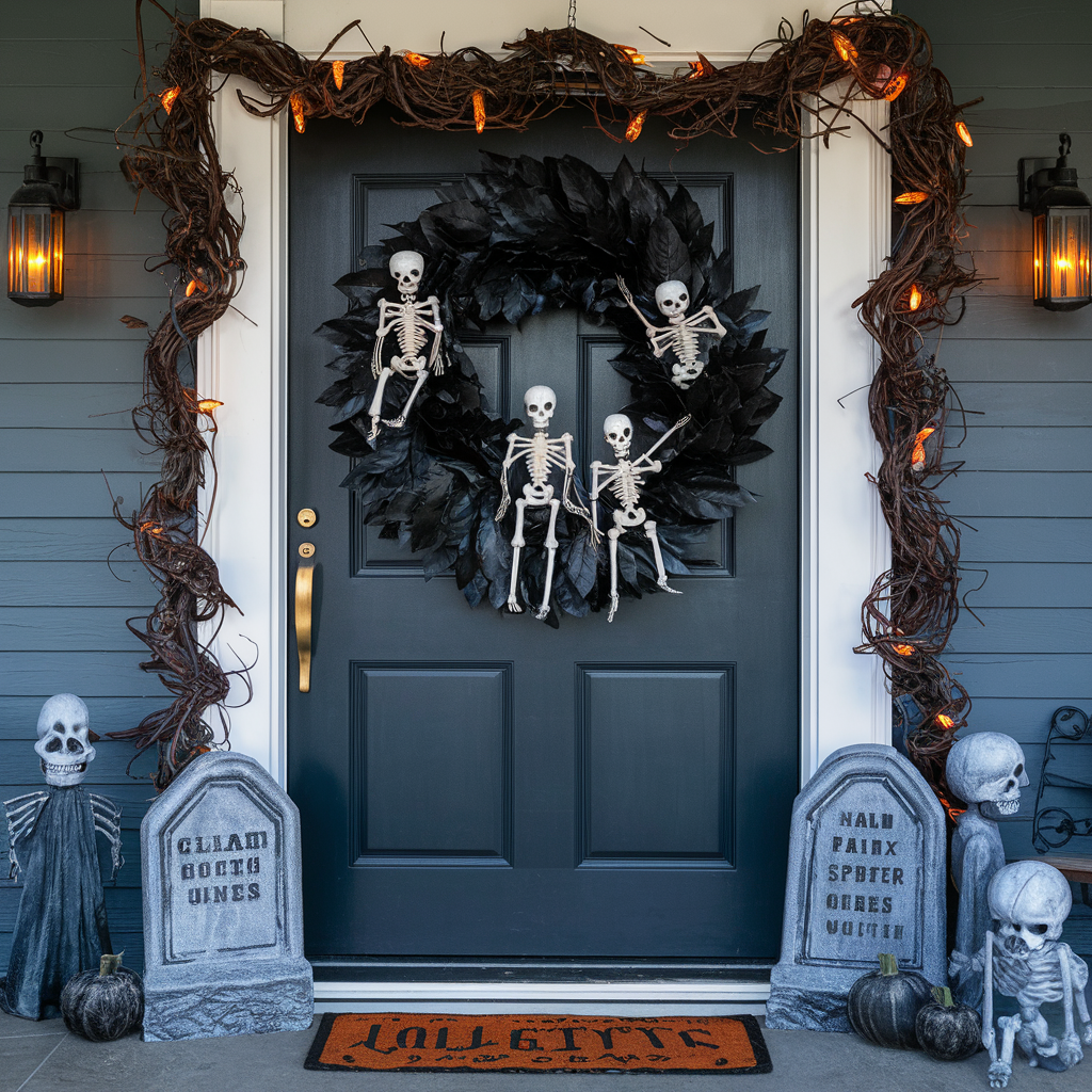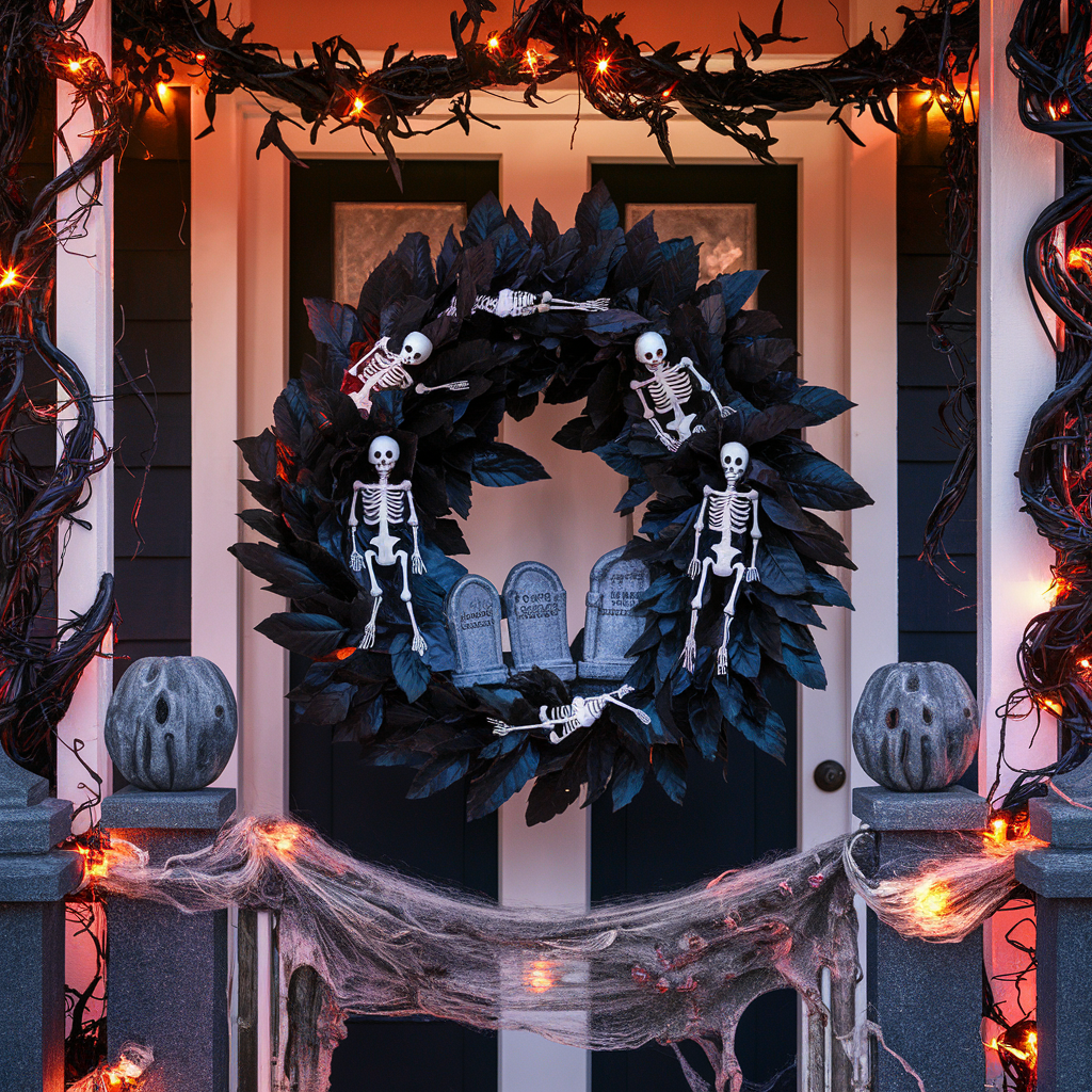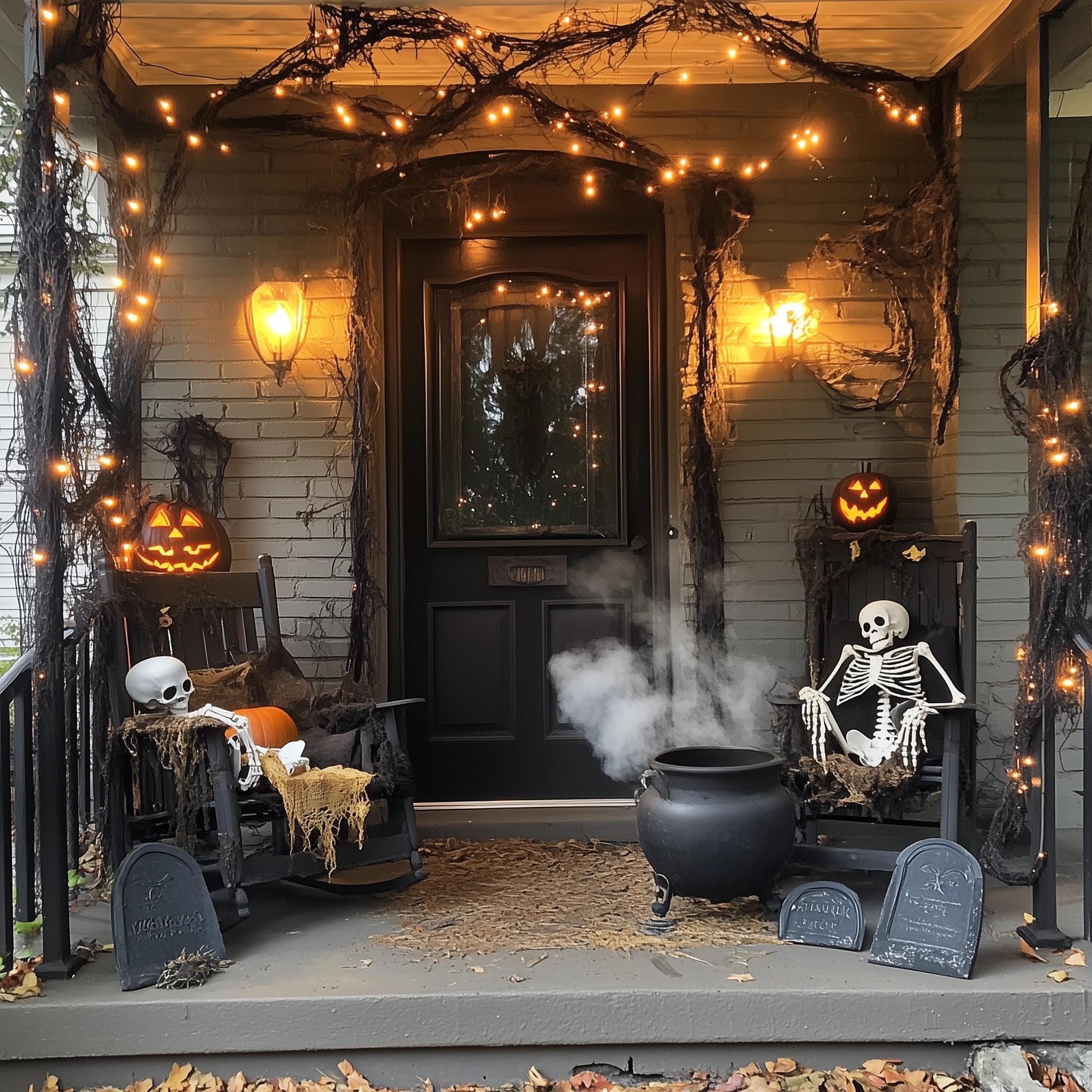 Wreaths and garlands are classic decorations that can easily be adapted for Halloween. Create a Halloween wreath for your porch using black leaves, miniature skeletons, and tiny tombstones. Complement it with a garland made from twisted vines, faux spider webs, and orange lights. Hang these decorations around your porch entrance to welcome—or scare—your guests.