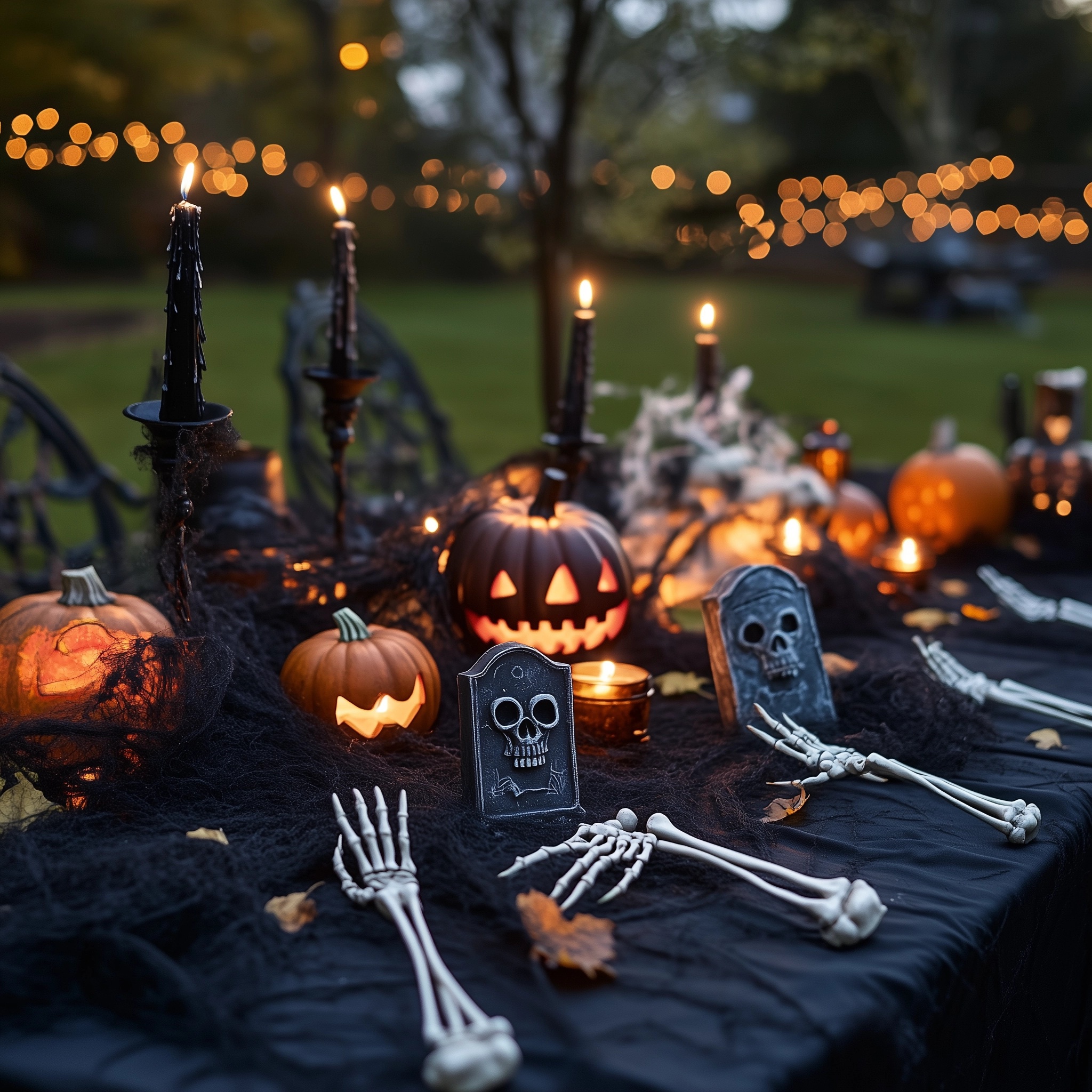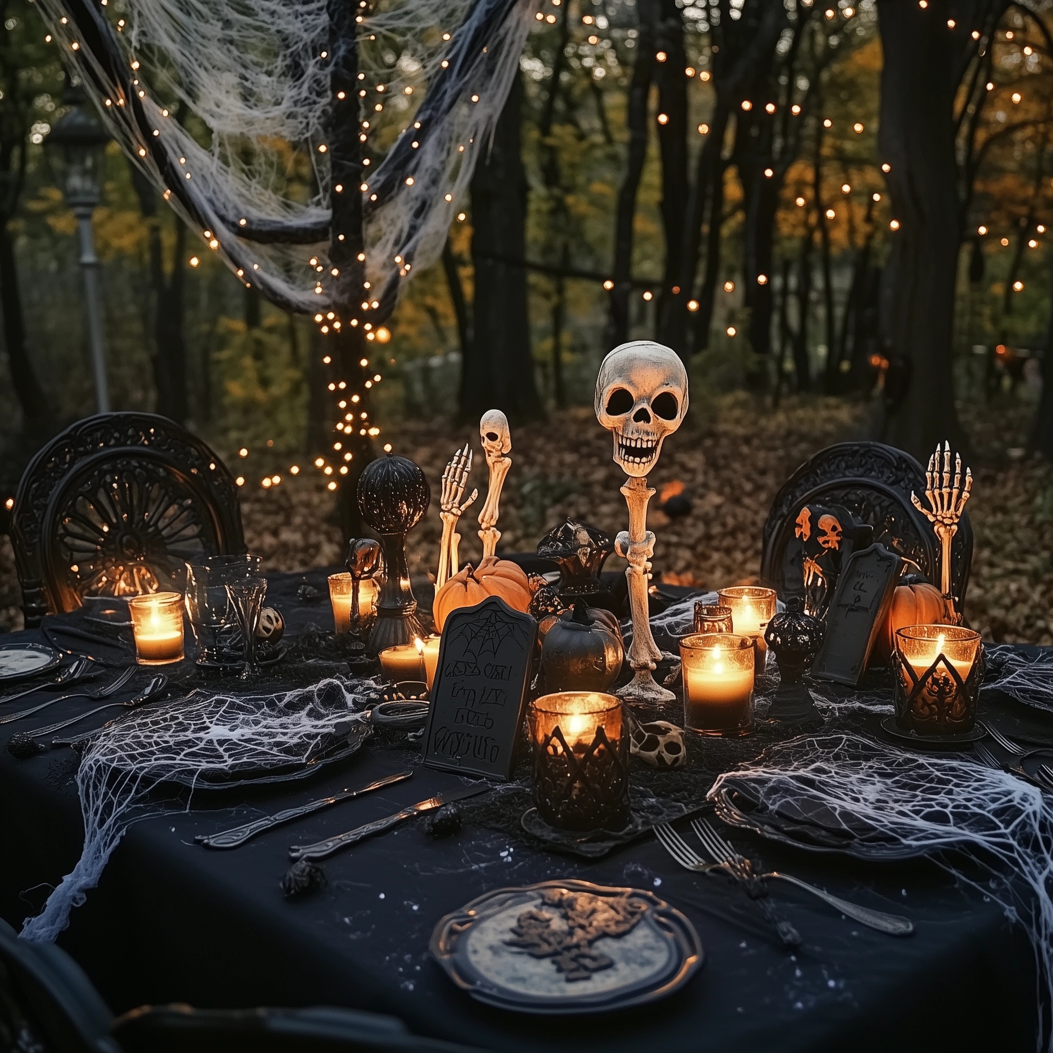 The scary theme of a Halloween table should also be absorbed by the outdoor table settings you are going to utilize for the party. Use black tablecloths, skeleton-hand shaped utensils, and candle holders designed as tombstones or cauldrons. The table should be decorated with mini pumpkins, faux cobwebs, and flickering candles. Additionally, the fairy lights positioned around the table will bring about an even more immersive glow as the evening advances.
