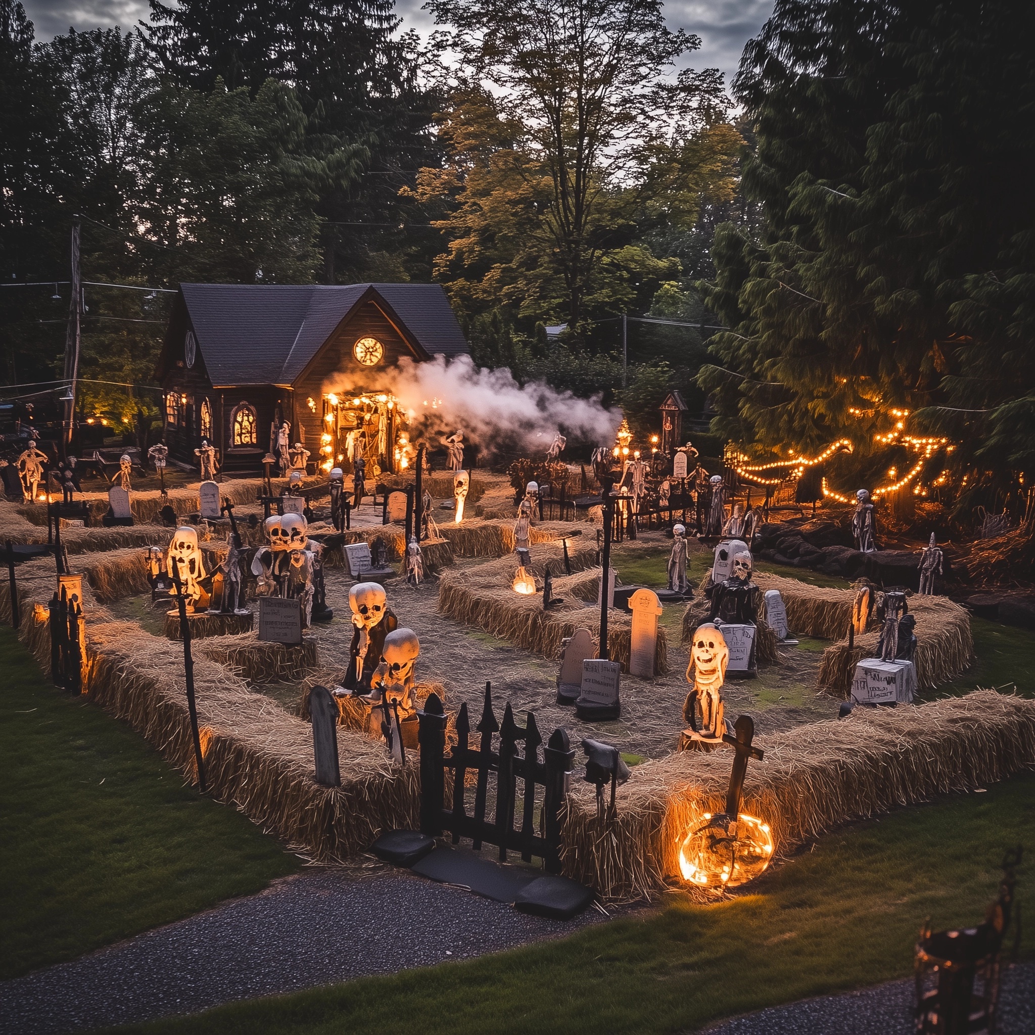 Making a spooky graveyard in your yard is an old-school way to create the haunted-out look. One of the first setups is the arrangement of tombstones of various sizes across the yard, and then creating the illusion of freshly dug graves by shaping mounds of dirt in front of each one. Scattered old, gnarled branches, and fallen leaves here add a dim nostalgic atmosphere. For the amplified effect, set the skeletons in obedience to it and let shadows cast long on the ground as the night becomes increasingly dark.