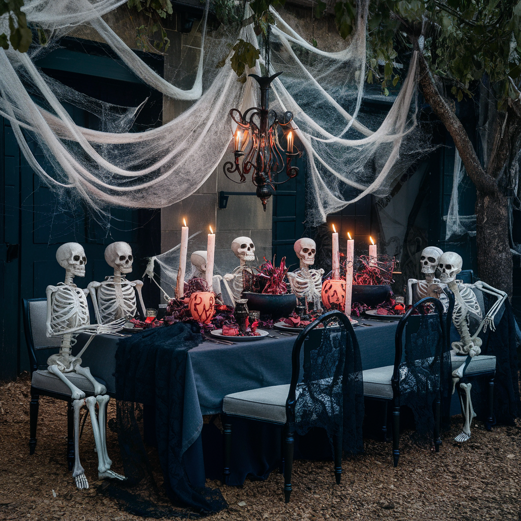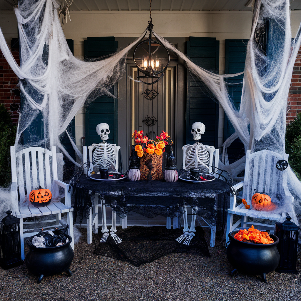 Don’t overlook your outdoor furniture when decorating for Halloween. Drape your chairs and tables with spooky fabrics, such as faux cobwebs or black lace. Add skeletons or ghoulish figures seated at the table, with cauldrons or planters filled with eerie elements like skulls or bones as centerpieces. Use dark lights to illuminate the scene, creating an inviting yet unsettling atmosphere for your Halloween party.