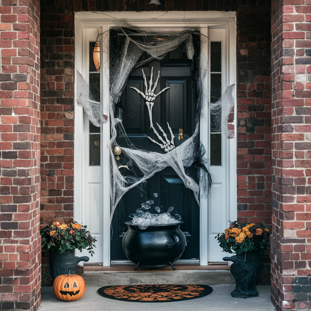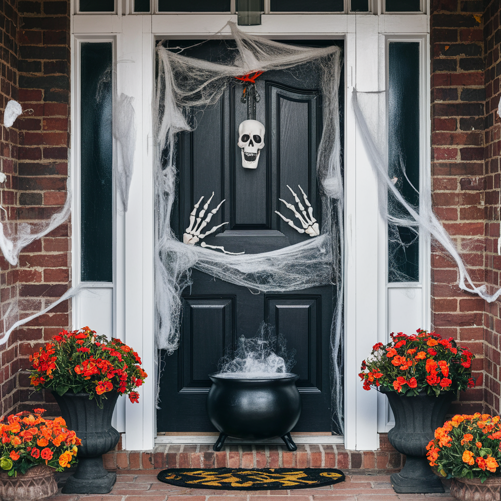 The main door is what guests first see, which allows them to be welcomed or brightened up—or the opposite. Make it a gate to a witch’s house by means of a few innovative tricks. Drape the entrance with the tattered black fabric and faux cobwebs are woven. Also, put a notice board that says “Welcome if You Dare”. Use the door decorations that include skeleton hands reaching out and a cauldron with smoke coming out of it.