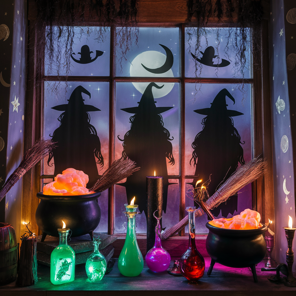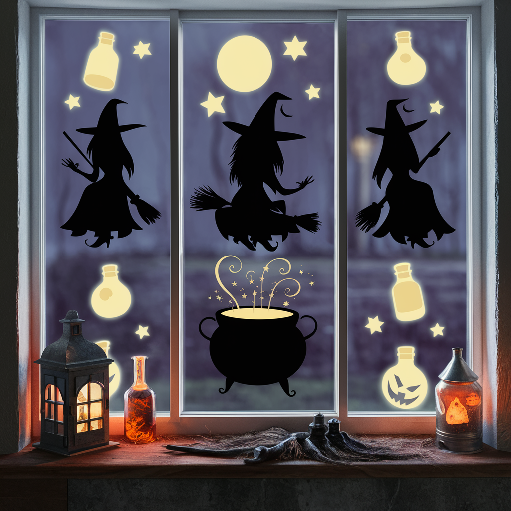 Witches are the most essential part of Halloween, and the window decorations will be a good opportunity to create a magical and spooky atmosphere at your home. Use cricut machines to cut the silhouette of witches, cauldrons, or flying broomsticks. They can be jointly with other magical features such as glowing potions, black cats, blue moon, and star decals. This theme is equally ideal for indoor and outdoor spaces, thus creating a bewitching atmosphere that will make the Halloween party night unforgettable.