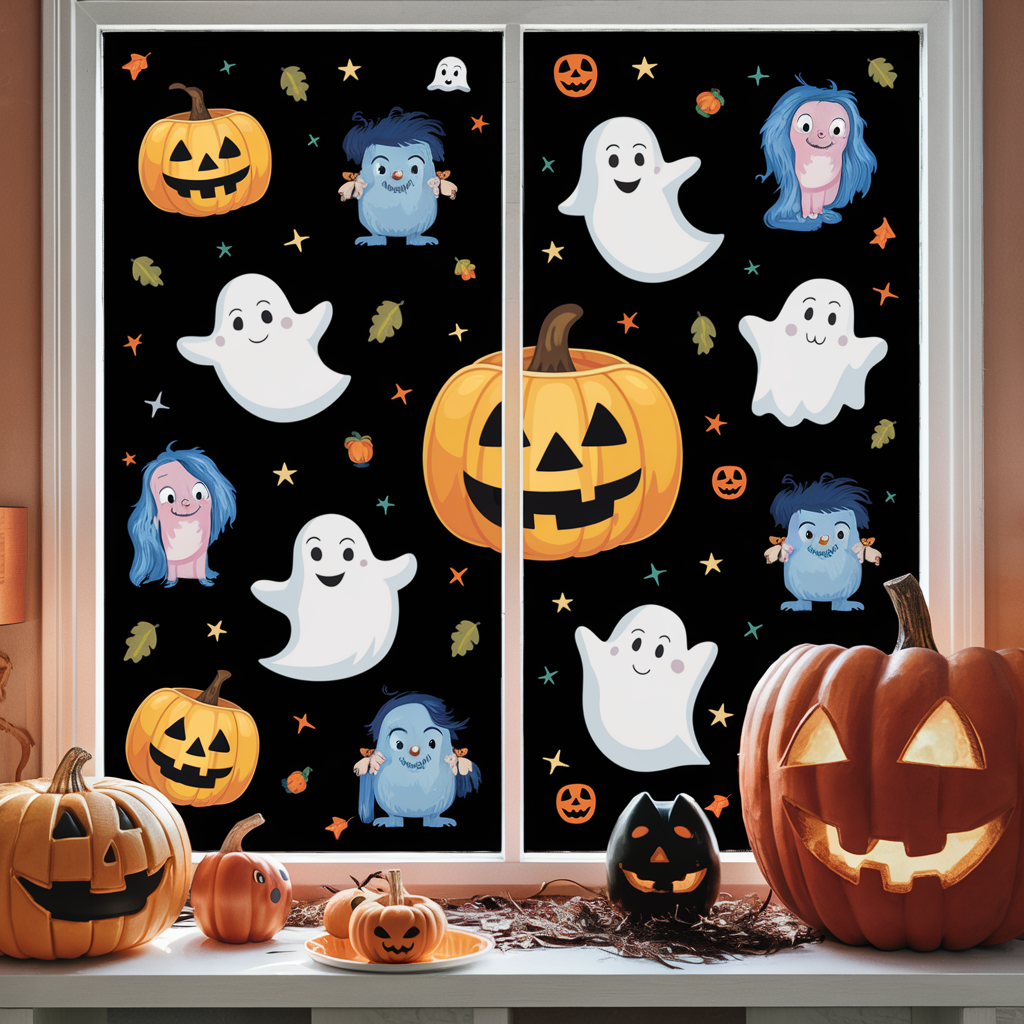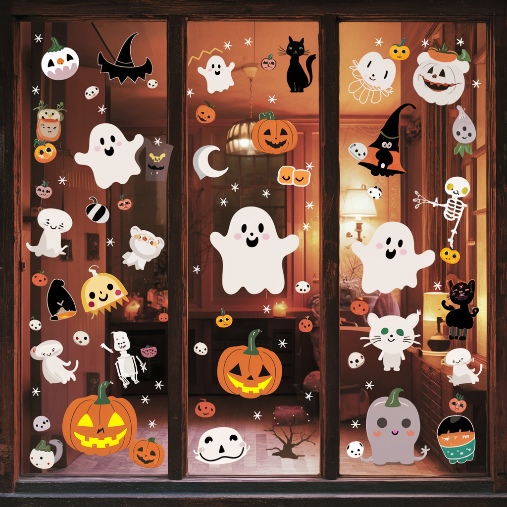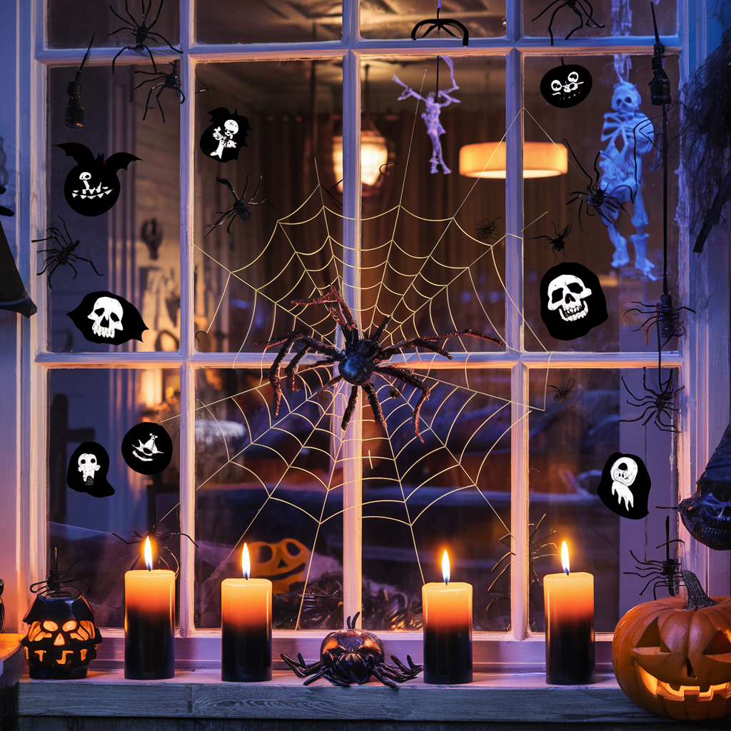 Stickers make simple Halloween window decoration projects for people who prefer a simple and hassle-free approach. Assorted designs can be easily accessed for purchase, ranging from cute ghosts to vicious monsters for kids to adults. It is best to use these stickers because they are easy to apply and remove. This is especially true if you want to change the decorations each year. These little guys can also be part of the classroom, preschool, or indoor home decor. Add low-budget DIY crafts from Dollar Tree to make it even more fun.
