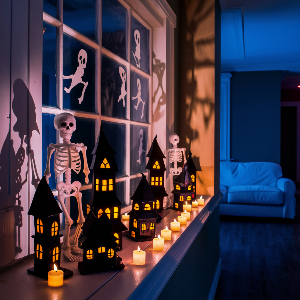 Almost any Halloween decor can be turned into a ghostly silhouette, which is a timeless style that is very easy to make. You only need black paper or vinyl and a spark of creativity to get things going. Cut out forms such as the skeleton, the pumpkin, and the haunted house, and smack them onto the windows to make spooky shadows both indoors and outdoors. At present, this is a very easy and logical way of creating a haunted house line-up in your home that does not require much time or even money. If you wish to add a touch of the supernatural, you can try low lighting or LED candles by the silhouettes.
