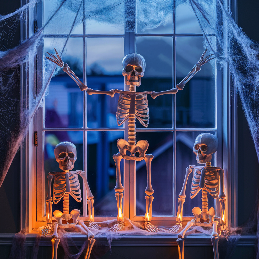 Skeletons are traditional Halloween symbols, and they can be used to create an attractive window display. You can either use black paper cutouts of skeletons in alternating positions or go for life-size ones that make it apparently look like people are climbing your windows. To create a setting one could only find in a horror movie, add elements such as flickering lights or spider webs to the skeletons. This DIY option for both indoor and outdoor windows adds to the dramatic effect of your Halloween decorations.