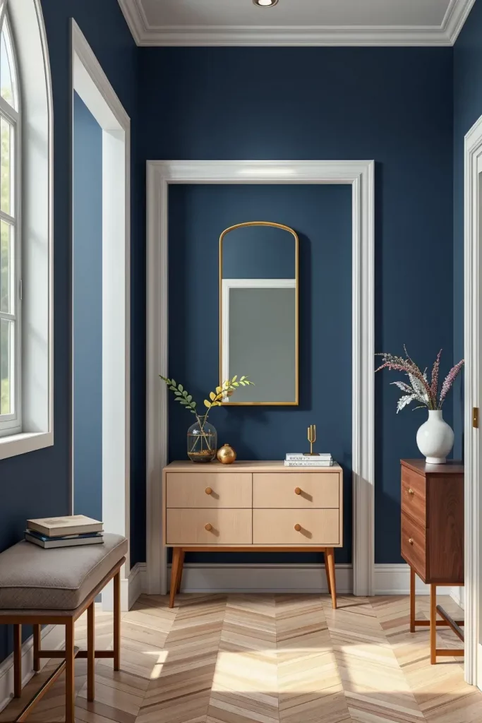 The matte navy blue paint I’ve used is combined with picture frame molding or geometric wallpaper that has warm ochre coloring. They define your style, so you don’t have to worry about filling up every part of your space. You should use neutral furniture like an in-between console or a bench to draw attention to the wall. Include a thin mirror with a metal border or a vertical piece of art to use the wall beginning above your bed.