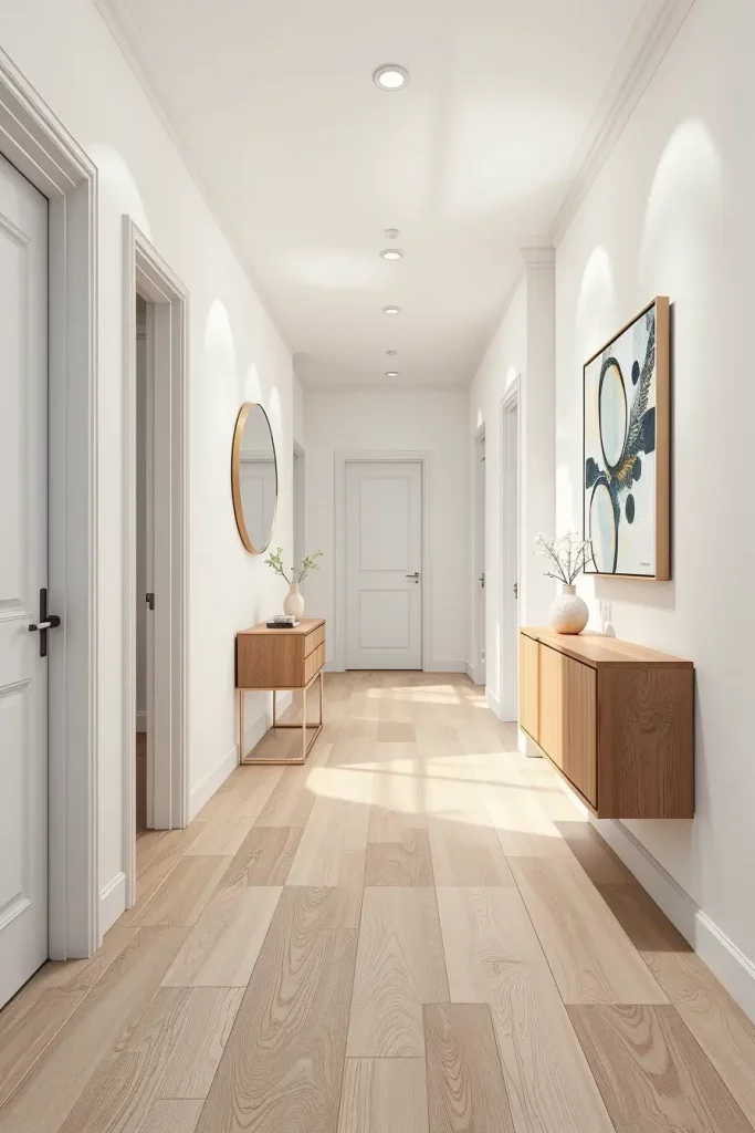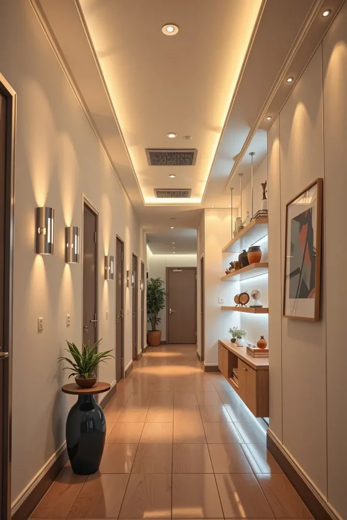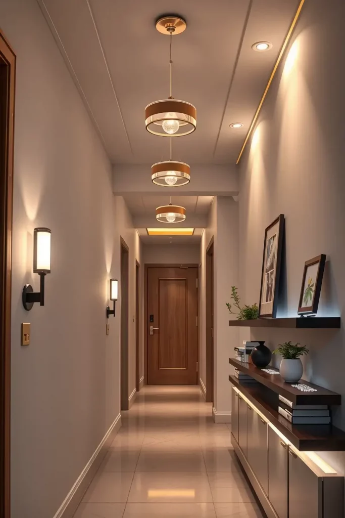 I often notice that poor lighting is a large design issue in many hallways. I handle this by using a few lighting techniques that help transform the dark passage into a cheery area. The combination of ceiling lights, wall lights and floor lights is my first choice, so that shadows are reduced and the space looks longer.
