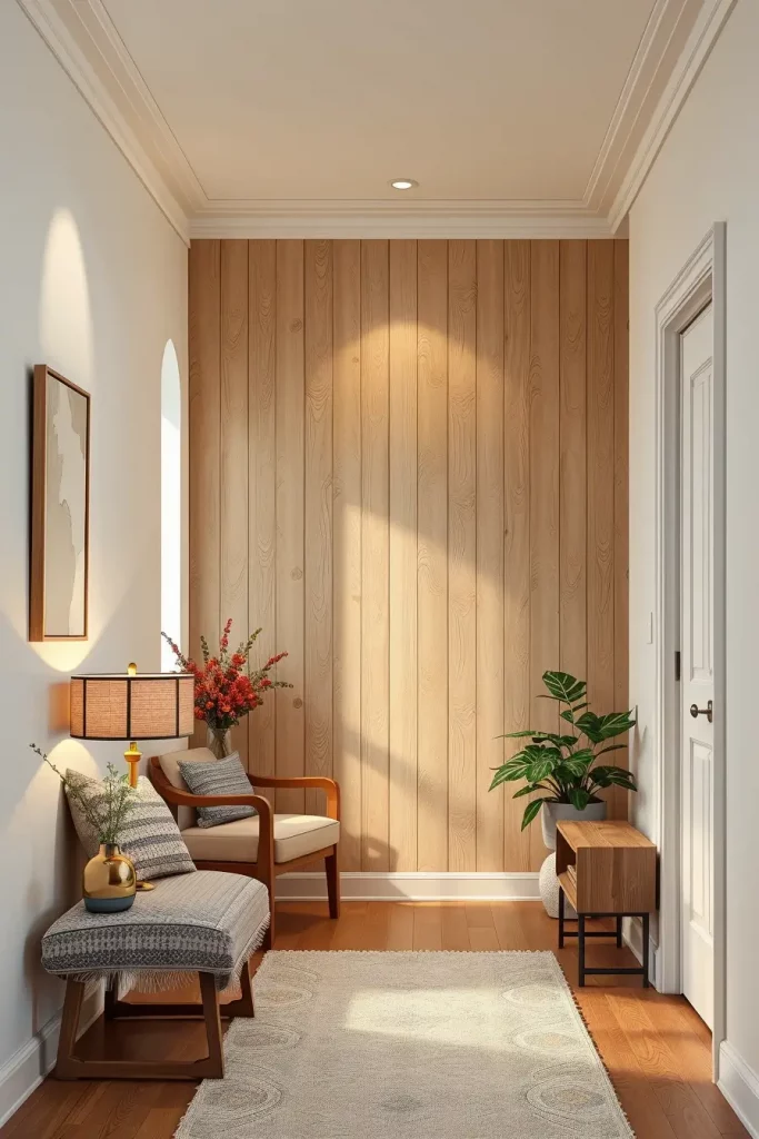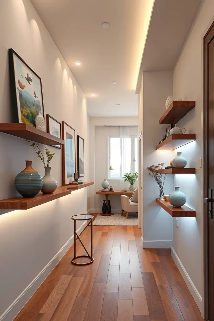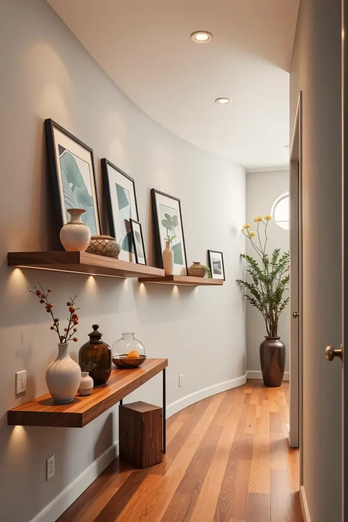 Using these shelves is one of my favorite methods to fill empty wall space. I created a hallway with shelves on the wall and strips of wooden panels nearby—it looks great and is very textured. Built-in or standing features often make a difference in transitional spaces, as HGTV often points out and I’ve noticed many times.