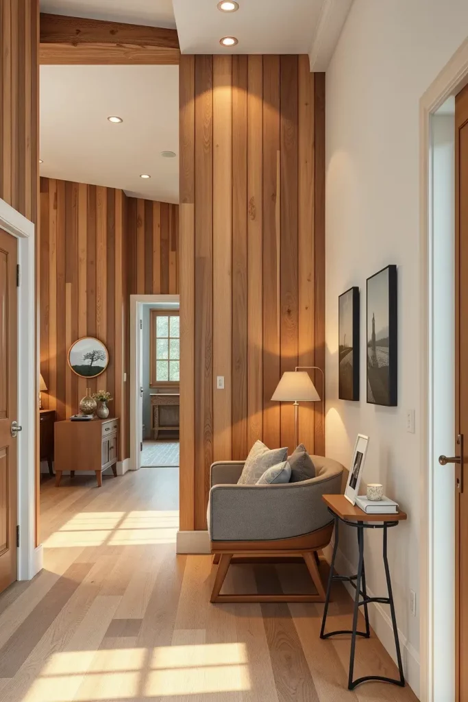 Instant warmth, interesting texture and a high level of craftsmanship are all noticeable with wood paneling in a hallway. I often use vertical slats, shiplap or wainscoting panels to give a welcoming or classic effect to long hallways. Wood looks rustic if finished with knots and cracks, coastally if neatly spaced and white and smooth and modern if unstained and carefully built.