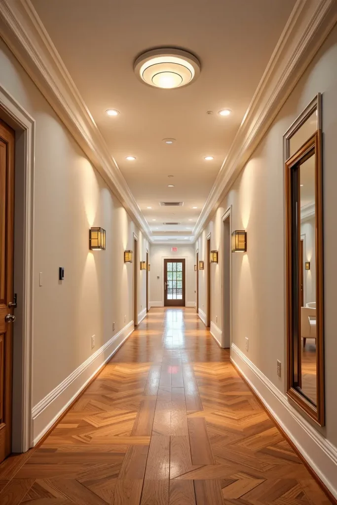 It’s best to use flush-mount or recessed LED lights in narrow hallways. For a longer route, I provide an even distribution of sconces along the walls which flows easily and emphasizes any outstanding features or architectural elements. Mirrors across from windows or light points will help brighten the room more naturally.
