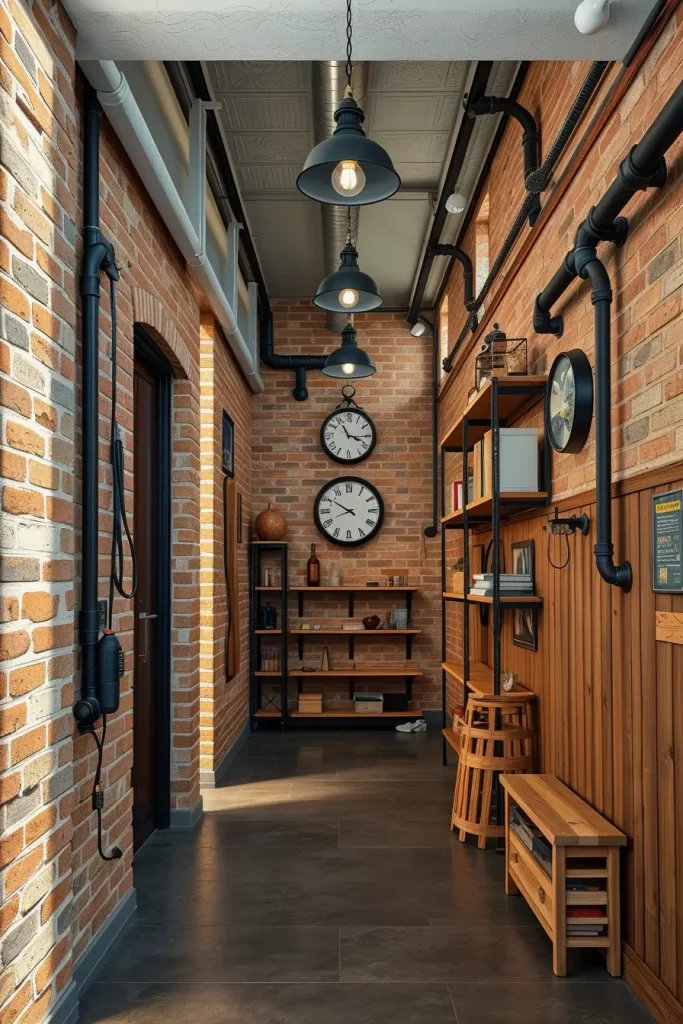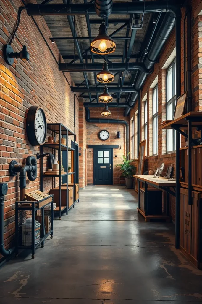 People who want to make their hallways more exciting should consider industrial designs. To give a modern and urban style, I use exposed brick, blackened steel and distressed wood in my interior design. It is ideal for lofts or recently renewed city houses.