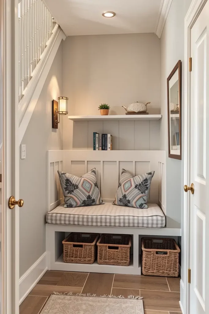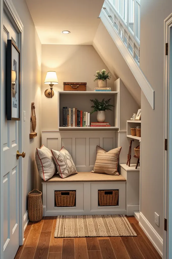 I usually start by fitting a custom cabinet to the stair slope and then place open shelves or drawers near the top to hold the needed items. Should the room be a reading nook, I will put in a bench with cushions, add sconce lighting and make space for a nearby bookshelf. When the space needs to be more useful, like for shoes and bags, I put up cubbies with baskets and hooks.