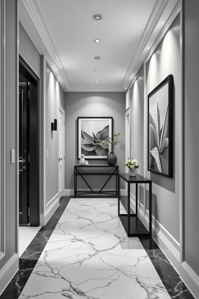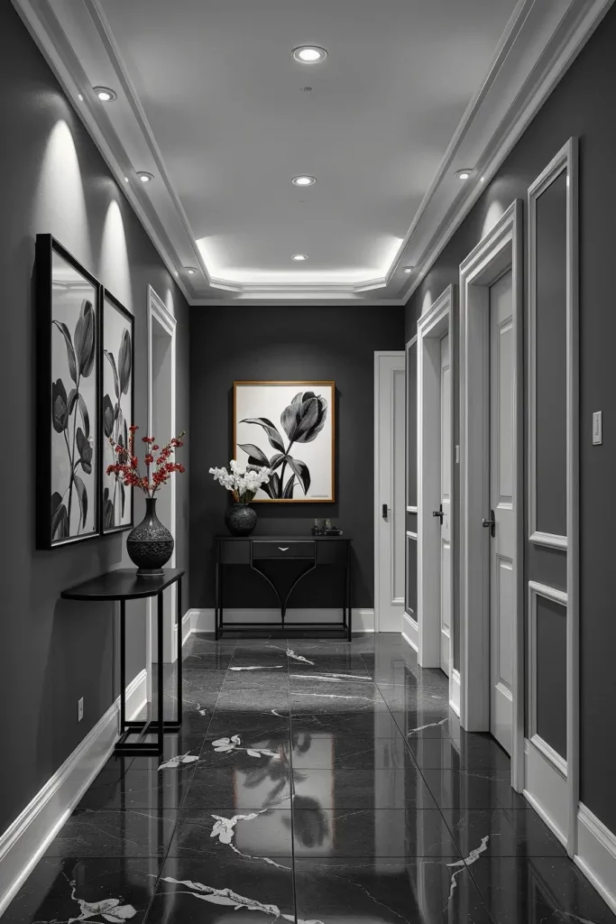 Picking a hall with only one or two main colors might look easy, but when done well, it looks amazing. I like to experiment with different tones of a hue to make a painting more harmonious. A black-and-white hallway always looks elegant, while a hallway in one color (blue or green, for example) can help set a calm or lively atmosphere.