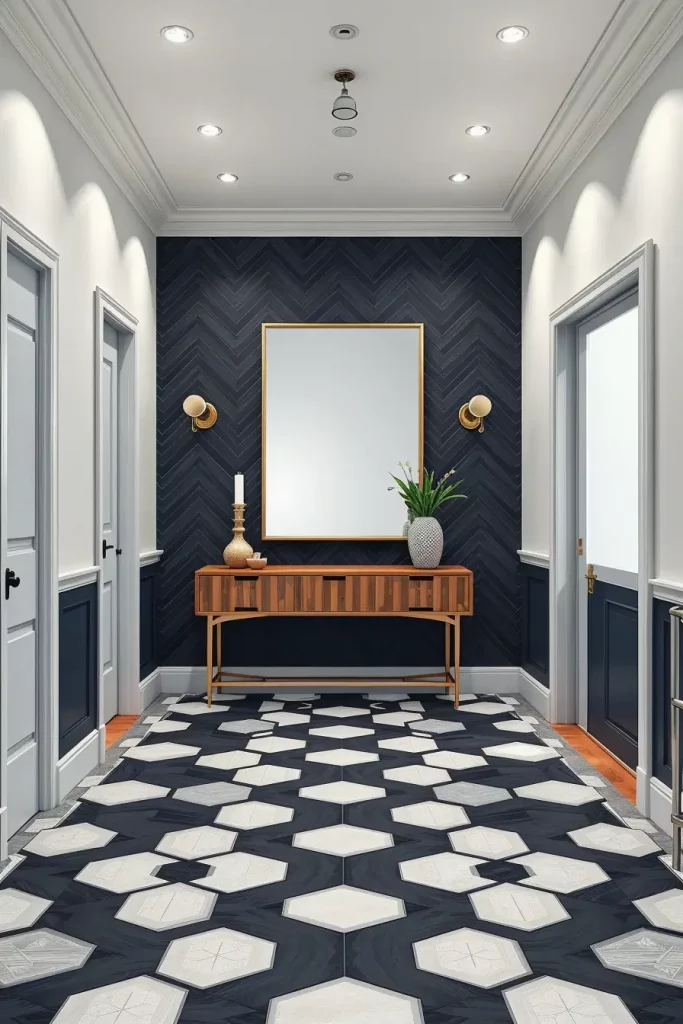 An easy choice for many is black-and-white hexagonal floor tiles which are both stylish and help hide both scuff marks and dirt. A chevron or striped wall design gives energy and depth to any modern room. I prefer setting them against things like thin console tables or mirrors so the prints stand out while keeping the room comfortable. Even the shade colors are important; grey, navy and deep greens are best paired with white or cream.