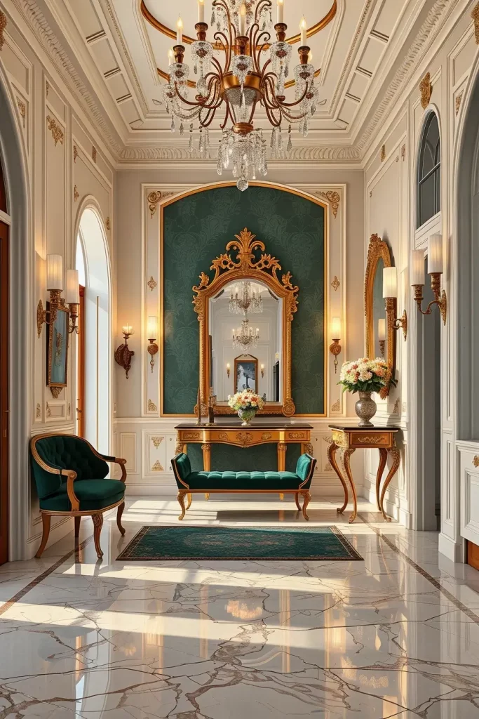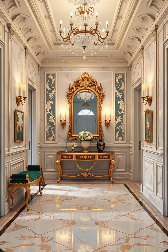 If your goal is for your hall to instantly look luxurious, use chosen materials and polished designs. I tend to use this style in upmarket homes or for people who aim for a powerful first impression. We’re talking about marble floors, gold-outlined mirrors, velvet seating and crystal chandeliers. They all combine to make the experience feel like staying at a hotel.