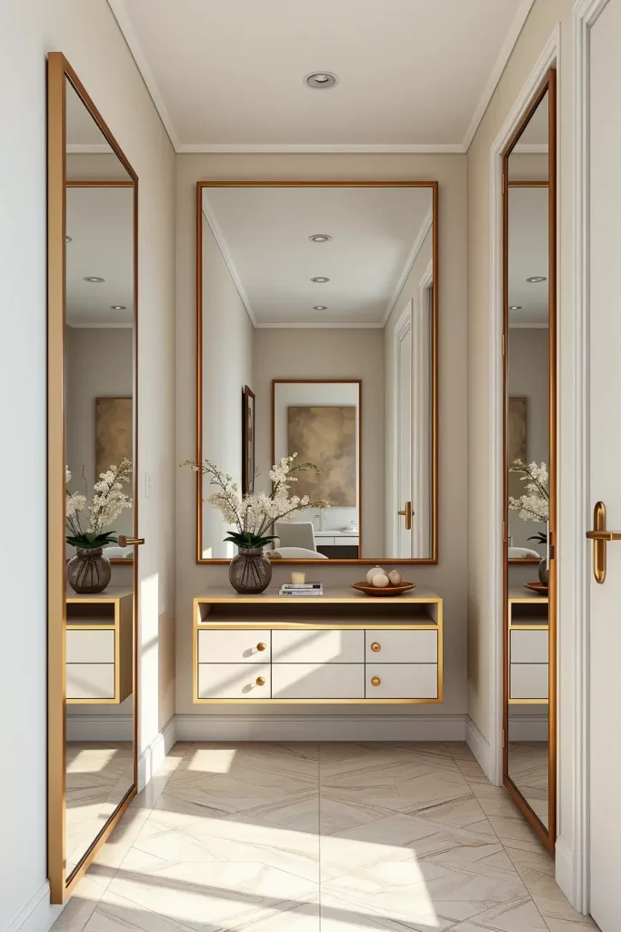 Mirrors are a designer’s secret weapon—especially in cramped or narrow hallways. They let light through, open the room and seem to give the room depth. If your hallway is tight, I’d suggest using a large vertical mirror or covering one wall with mirrors. As soon as you include them, entries become open and appear more modern.