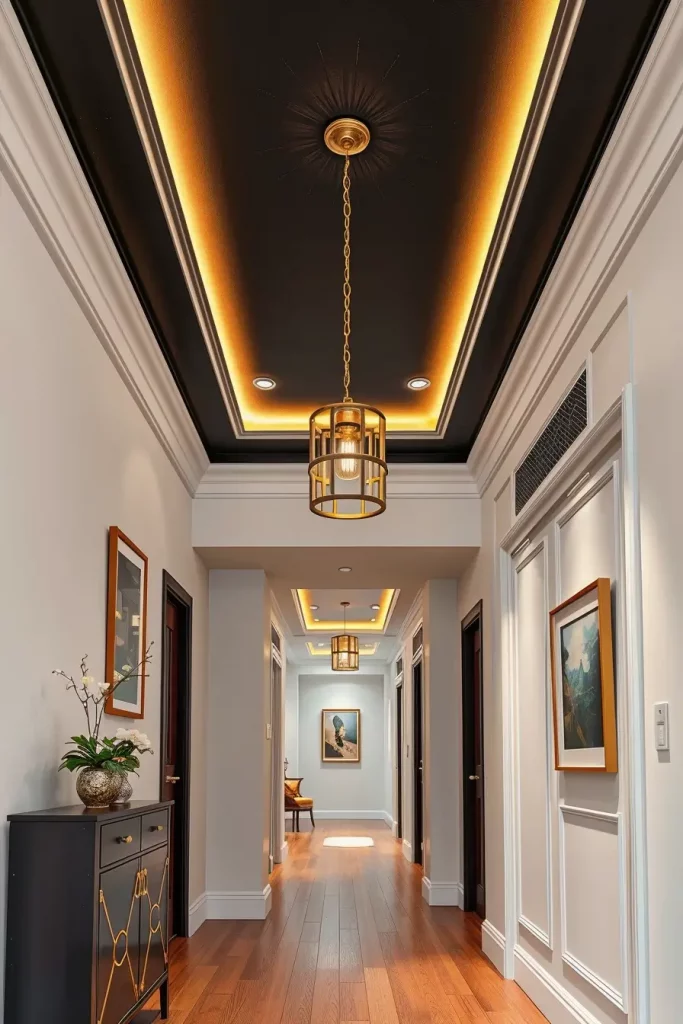 I’ve noticed clients being impressed that their guests notice the ceiling first which was something they never predicted. According to Dwell Magazine, embracing strong contrasts or soft metallics on the ceiling makes a big impression in modern hallway design.