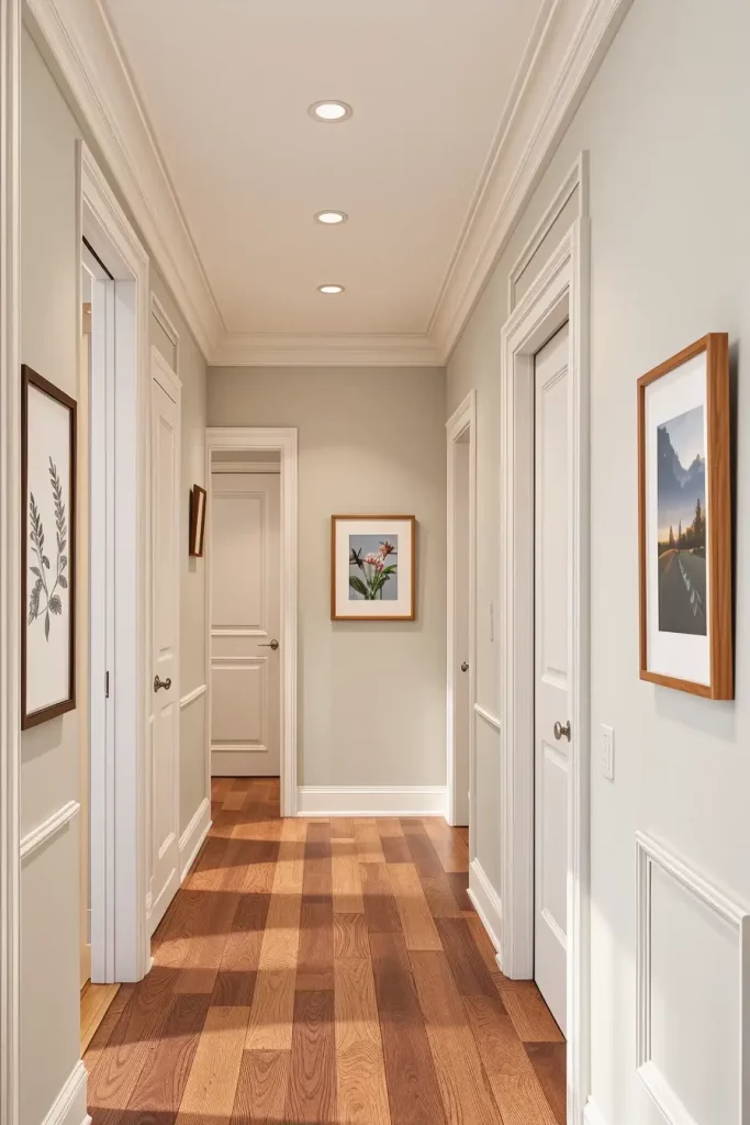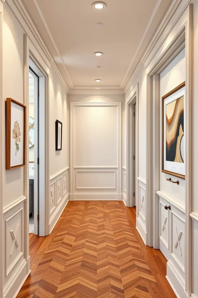 Simply adding molding to your walls can make a plain hallway appear more upscale and interesting. When clients mention architectural detail without major work, I suggest this solution to them. Whether it’s classic wainscoting, picture frame molding, or minimalist vertical slats, molding can visually elongate walls and define zones in your corridor.