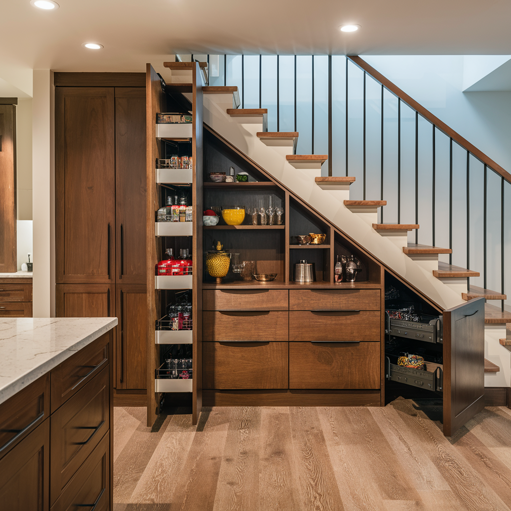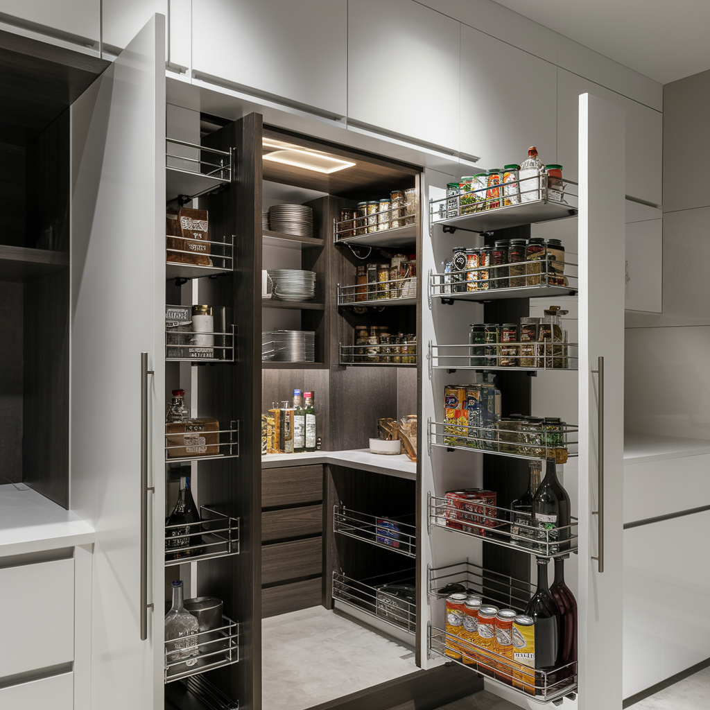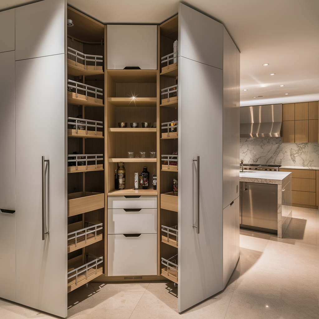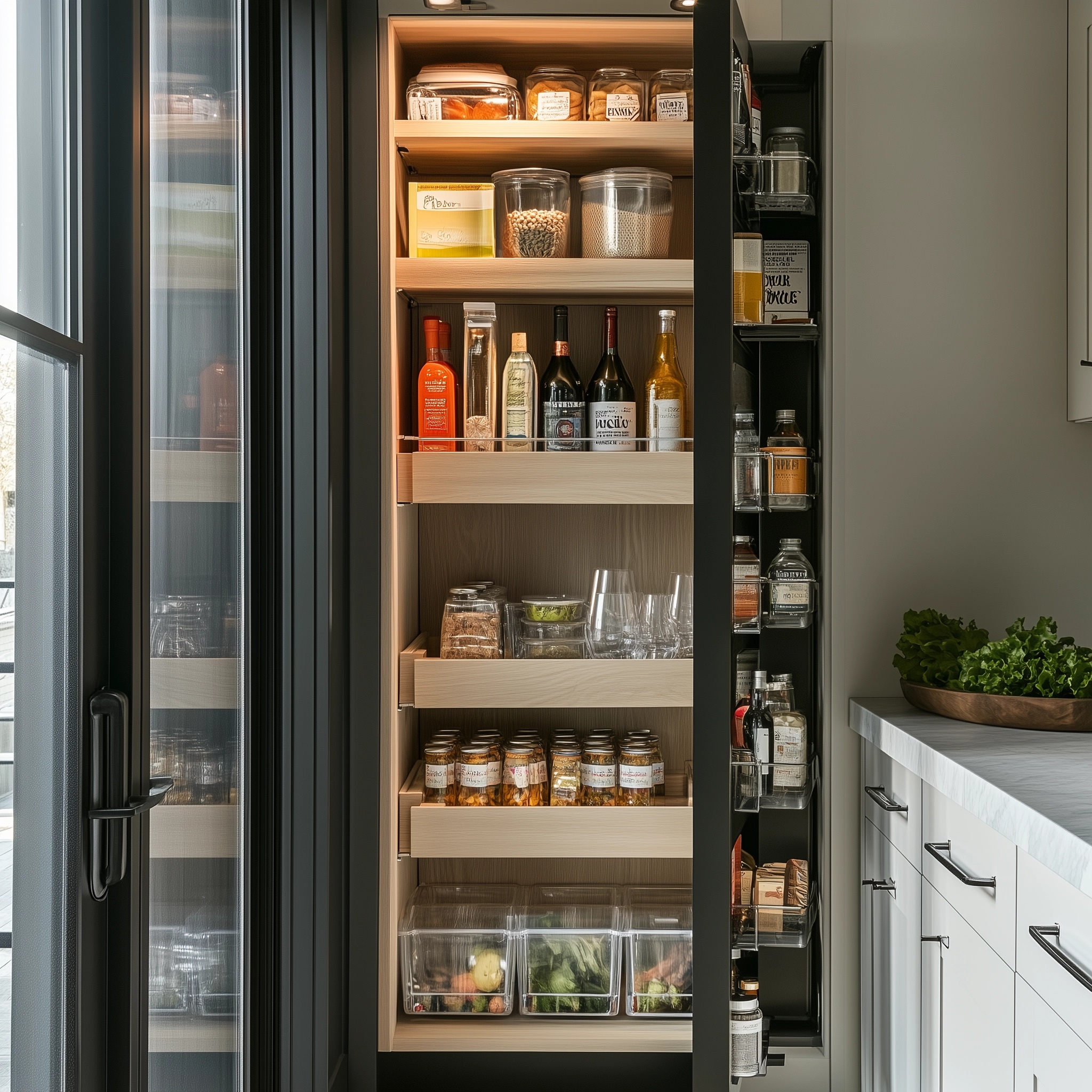 Effectively using the space available in modern homes is an absolute must, be it with hidden pantries or anything else. Bringing in narrow spaces or odd corners for the purpose of installing pull-out pantry shelves that will allow for stacking more items than one would expect is an option. The first choice would obviously be to opt for floor-to-ceiling shelving to make the best use of the available space.