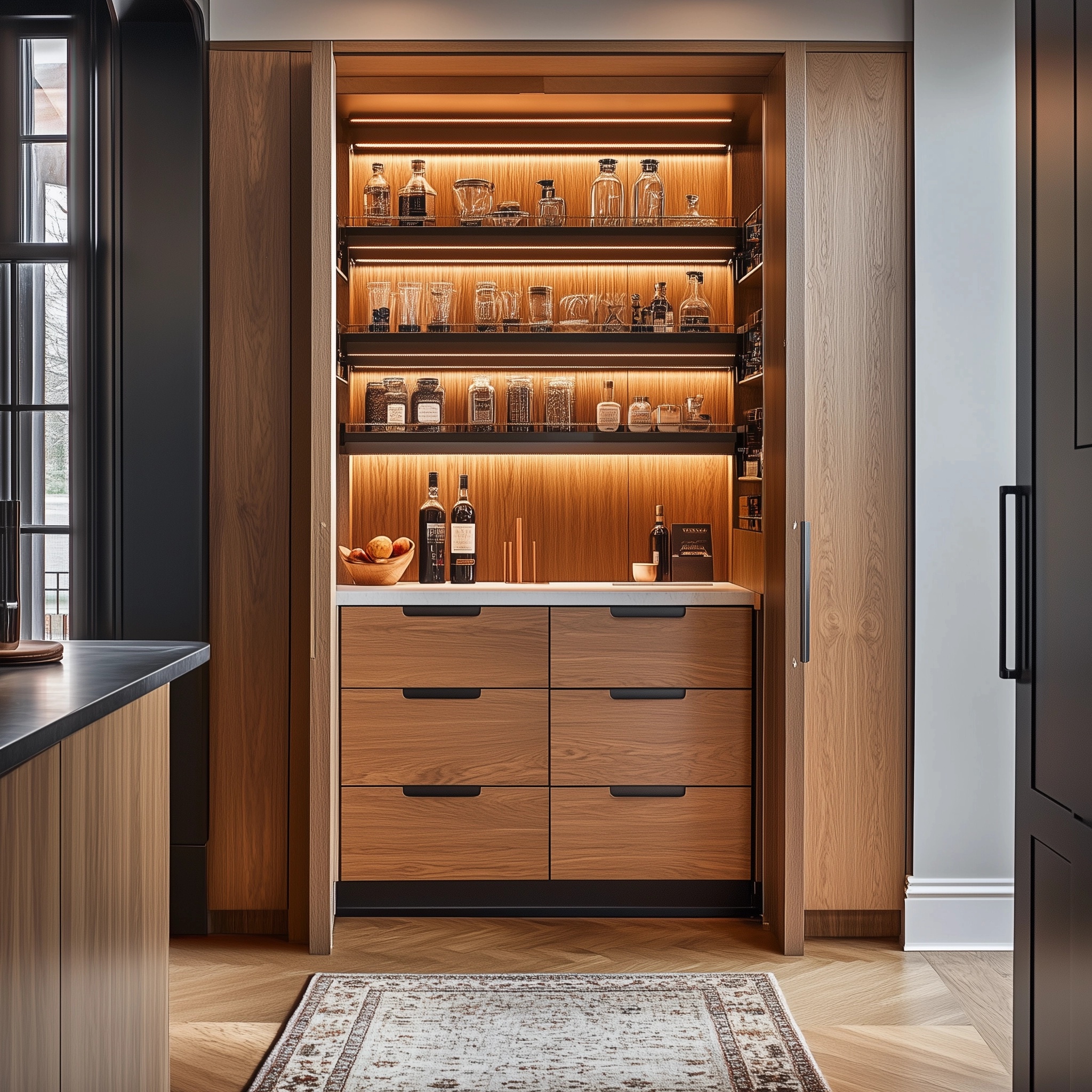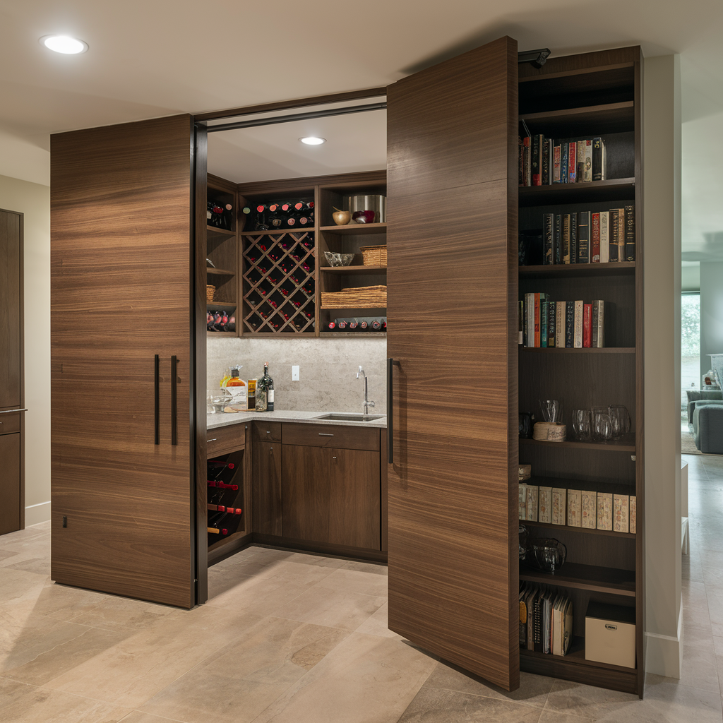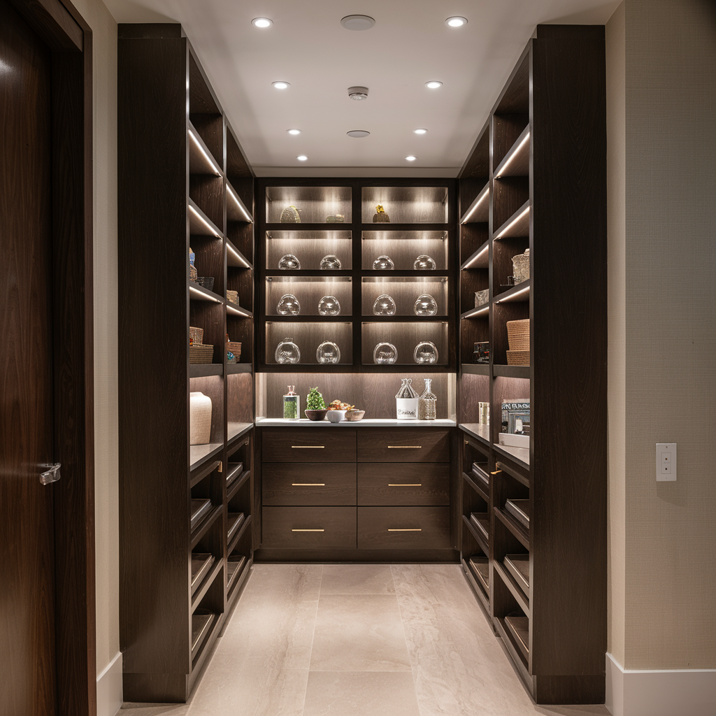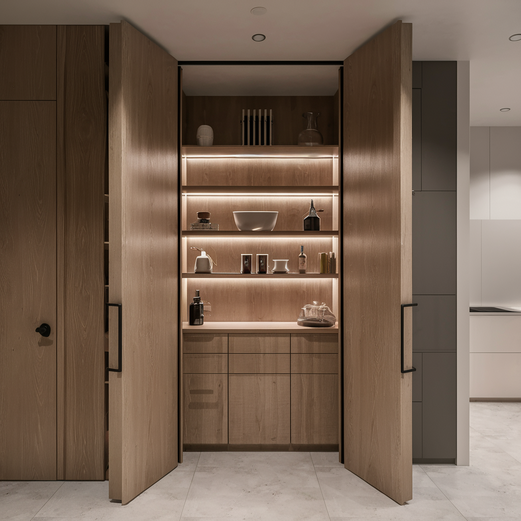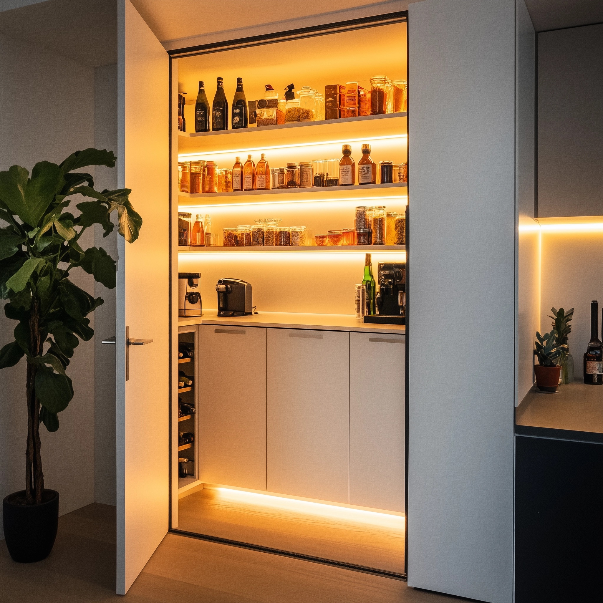 Lighting has a great impact on both the functionality and the atmosphere of a hidden pantry. Guarantee up-lighting in the ceiling for broader illumination, and use LED tape lights under the shelves to highlight the tasks. Dimmable lights help create a warm and enjoyable atmosphere along with ripening the pantry.