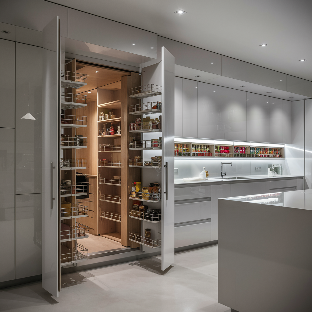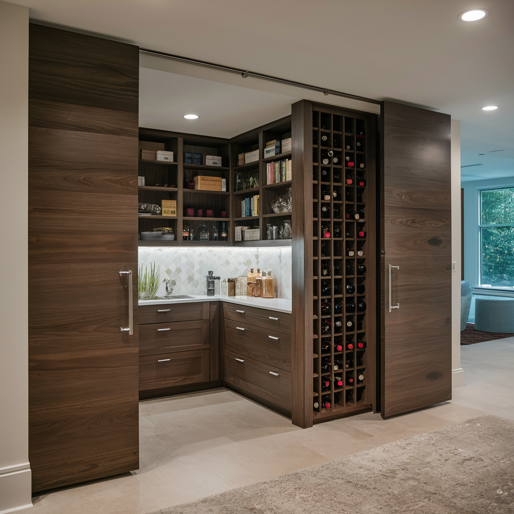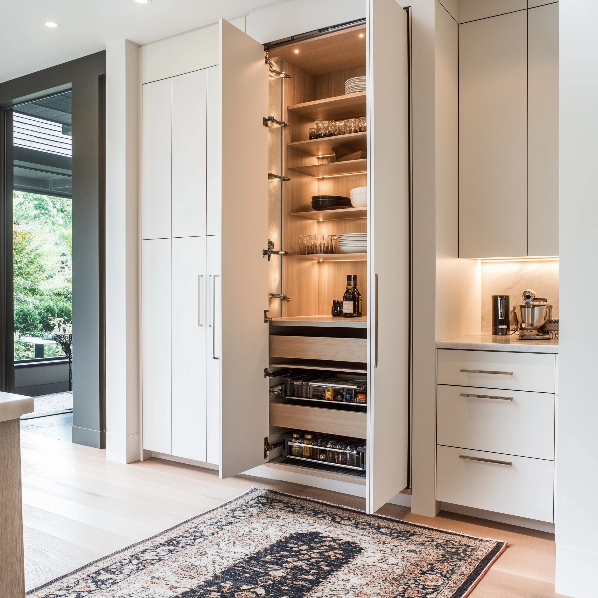 Modern hidden pantry cabinets are all about sleek design and functionality. Popular trends include handleless doors that blend seamlessly with the surrounding cabinetry and cabinets that open with a touch mechanism. Inside, look for innovative storage solutions like pull-out racks and built-in spice racks.