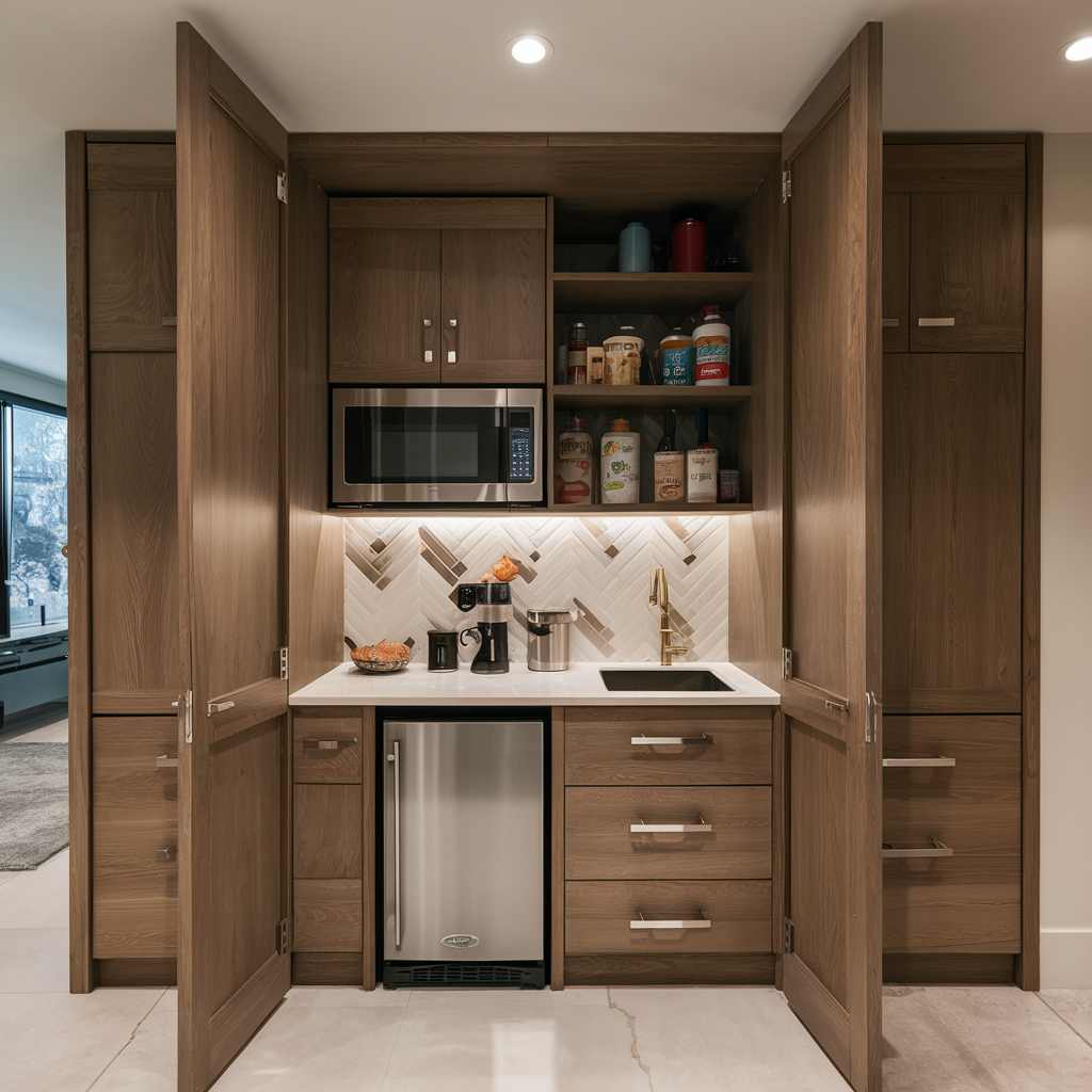 Bringing together home appliances into a well-designed modern hidden pantry has the potential to increase the usefulness of the space. You might include a small fridge, a microwave, or a coffee station in the pantry. You can keep the kitchen most clean with this design and it becomes a cheaper and more convenient area for work. Plan the ventilation and electrical outlets properly to support these appliances.