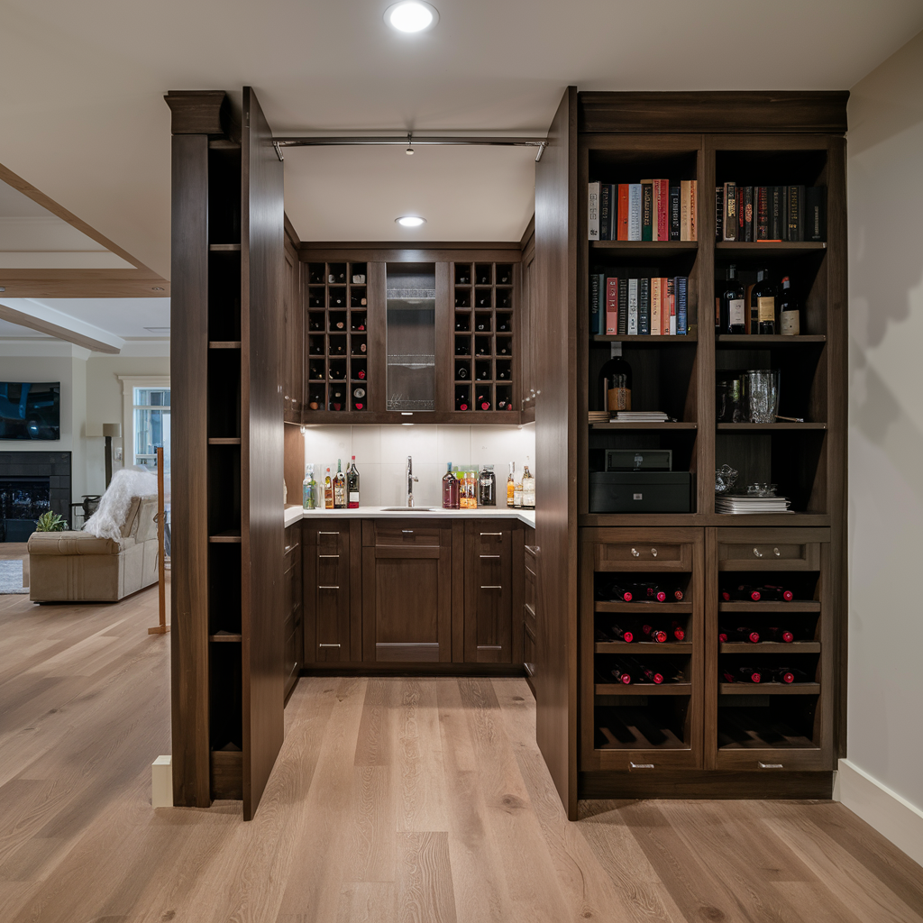 In a big mansion, the extensive space available makes it is possible to set up the hidden pantry in a more stylish way. As an example, a hidden walk-in storage space covered by a mere dummy cabinet or a sliding bookcase would be relevant. The hidden pantry can be kitted out with custom shelving, wine racks, and even a prefabricated area with the countertop and small sink.