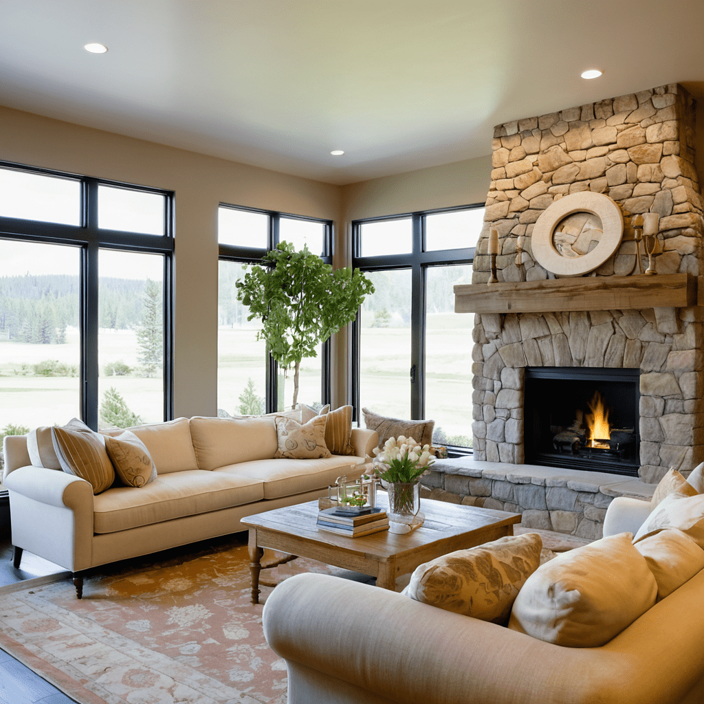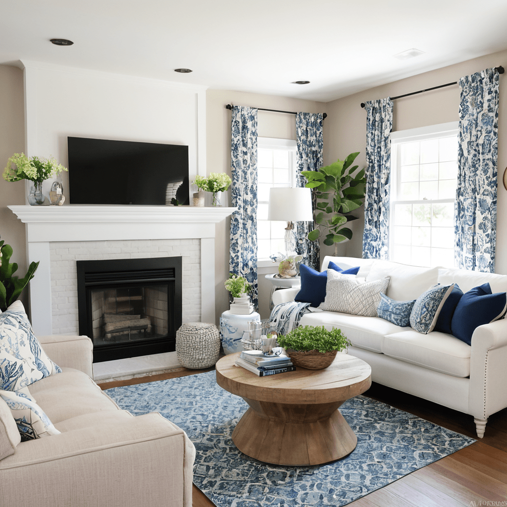 The name of the country Home living room is synonymous with comfort and warmth, and it uses natural materials and tones of the earth. One of the ways to pick up this style is by introducing first old, driftwood wall panels, floral patterned fabrics, and then warm-toned curtains into the outlook. Here is where the individual can also add their personal touches by choosing a vintage accessory or having a favorite book collection displayed. This idea is suitable for a room that appears lived-in and loved, giving a warm, storied atmosphere perfect for relaxing and chill out.