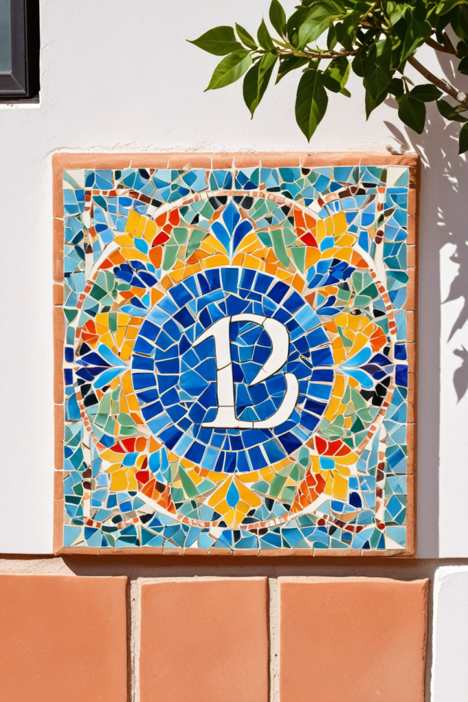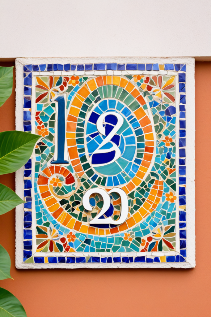 Mosaic style number plaques include a combination of tile designs, intricate motifs, and unique paintings that create a colorful and artistic flair. These plaques add a touch of individuality and style which is ideal for cozy Mediterranean and eclectic homes.