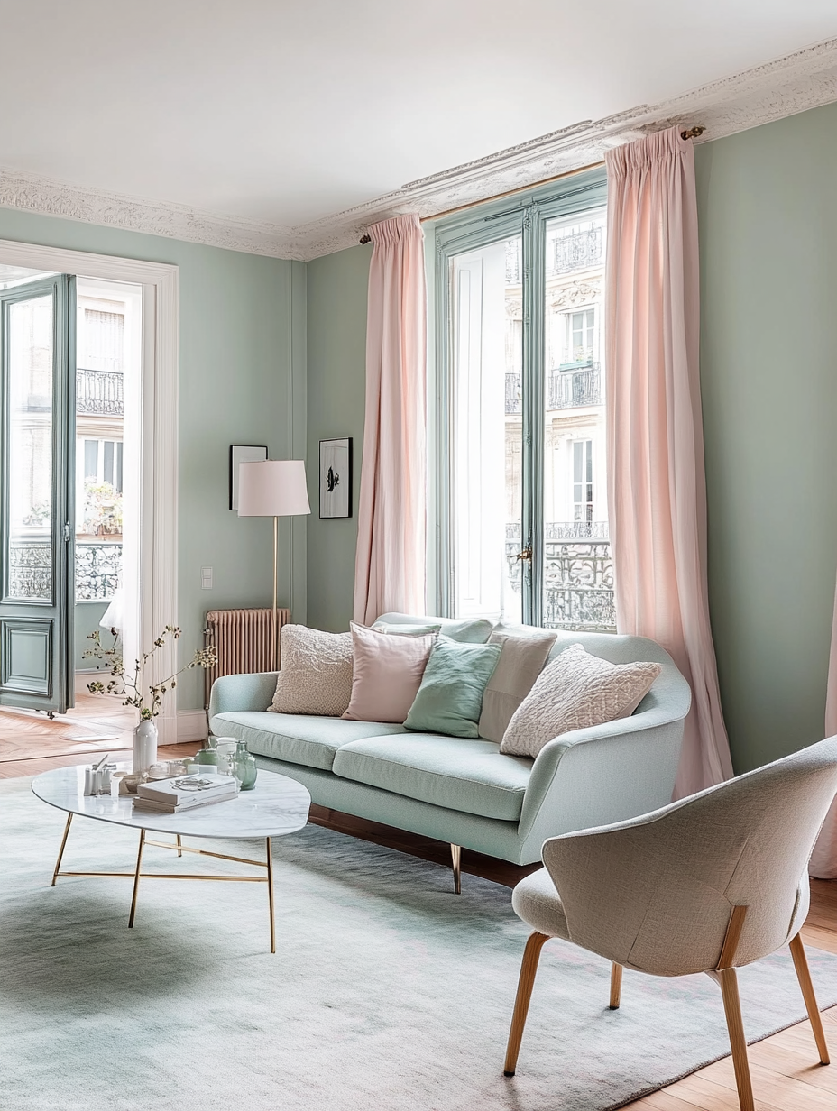 Having a living room designed with pastels can result in a gentle and peaceful atmosphere. This planning includes the use of gentle shades and faded colors, e.g., light pink, blue, and green, to add a little charm to the walls and furniture of the room. By these serene tints, in connection with the colors between them alone, you can create a gentle and harmonious living space.