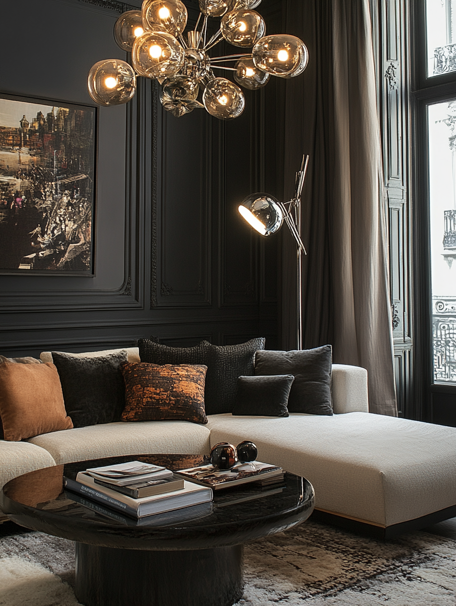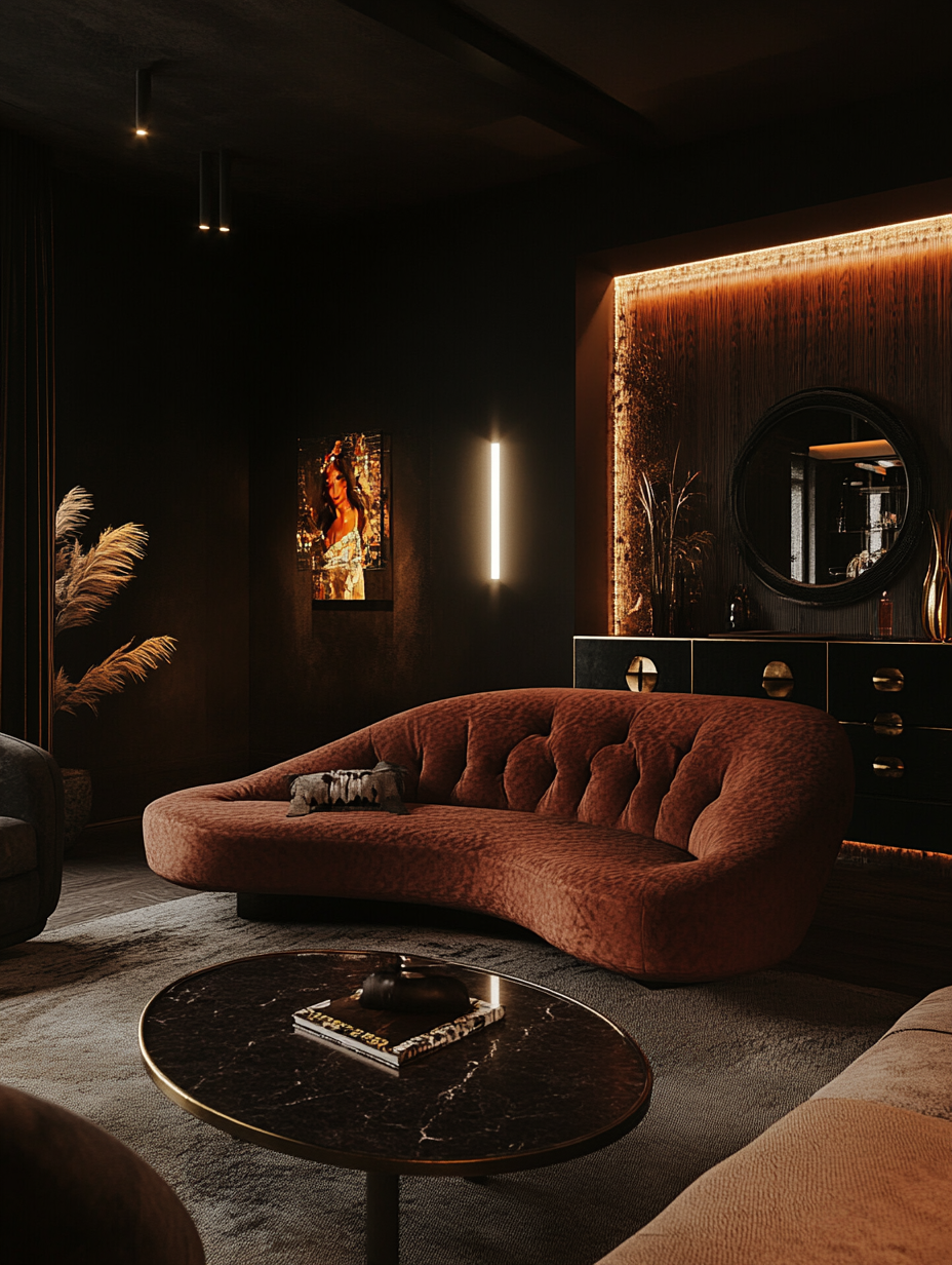 Living rooms that are gloomy and moody provide a striking, warm and inviting atmosphere by using dark colors and soft materials. The design is typically based on dark walls, comfortable furniture, and comfortable lighting to make the room look more intimate. It’s just right for people looking to have a living room that is grand, but at the same time, friendly and has a sense of ambiguity.