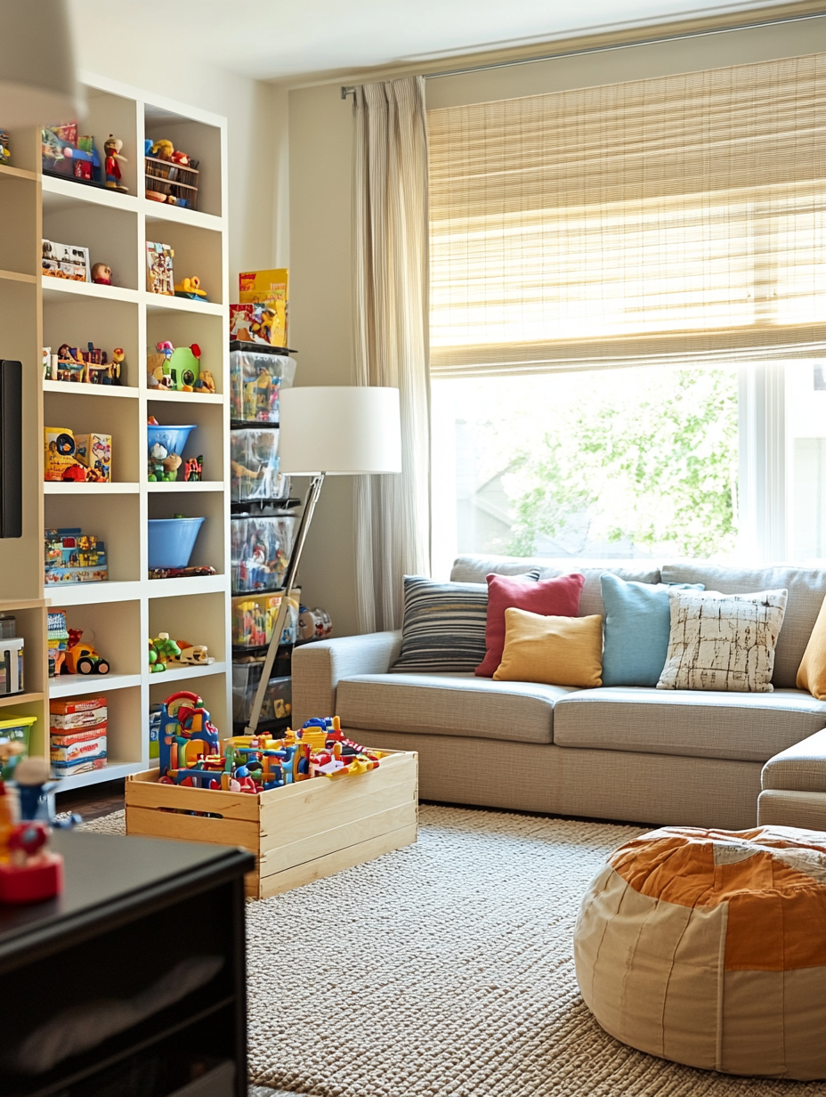 A happy living room design is one which is very comfortable, durable, and functional. This design emphasizes strong furniture, washable fabric, and a good amount of toy holding for the kids. You create special features at home that can be the basis of hospitality and lovingness.