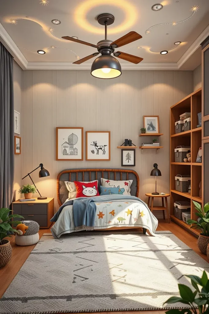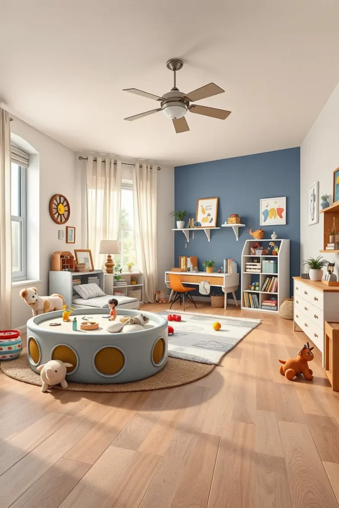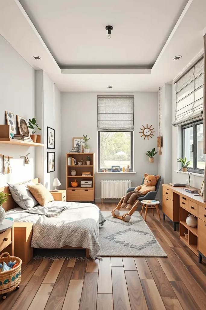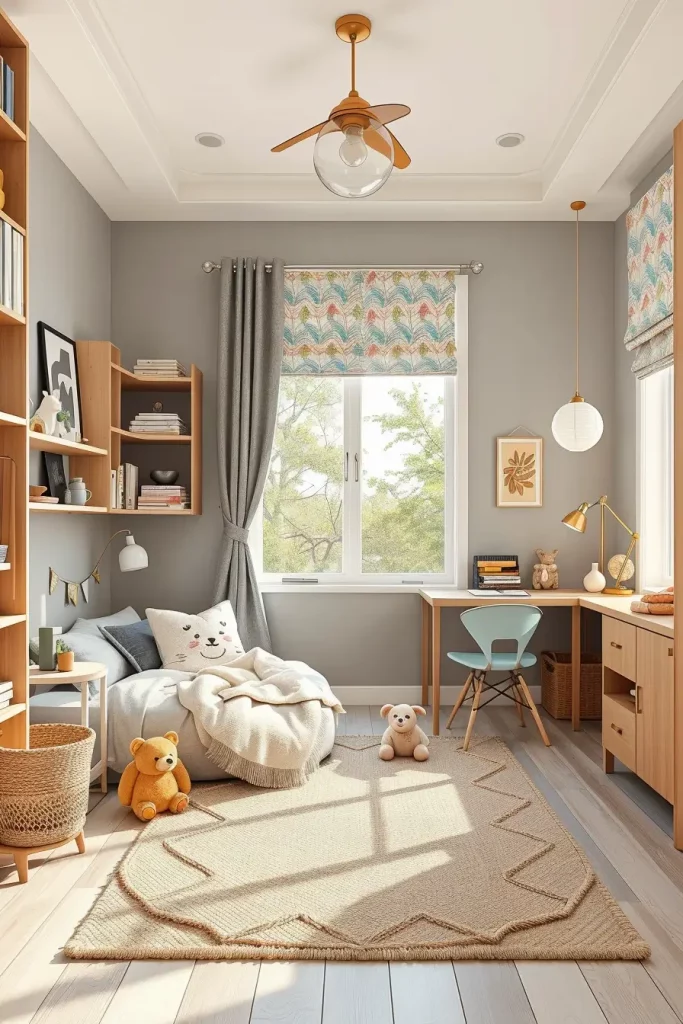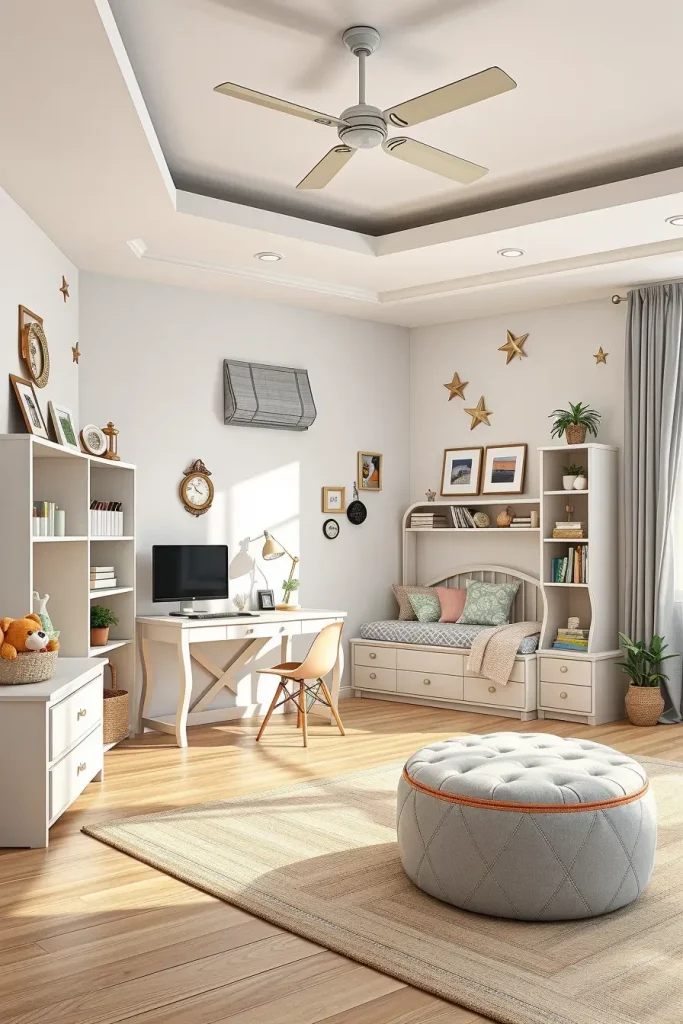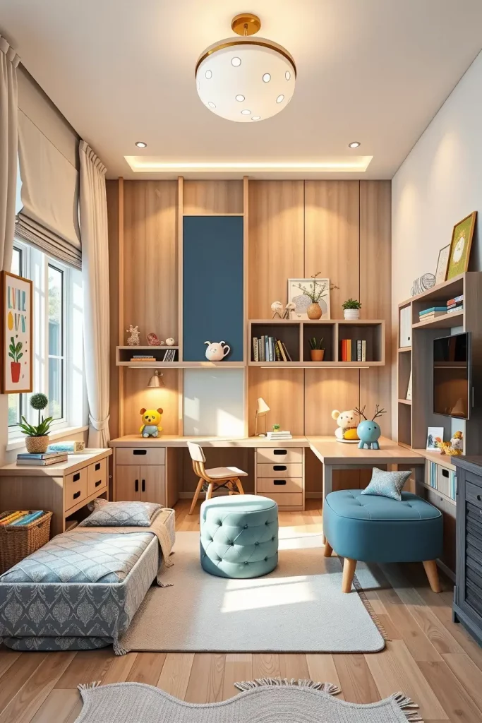 I usually use multifunctional furniture such as the drawers under the beds or shelvings that can be used as displays of play as well. Foldable chairs and narrow wardrobes are also excellent additions to the growing children. Such aspects make the room flexible to the needs of the child.