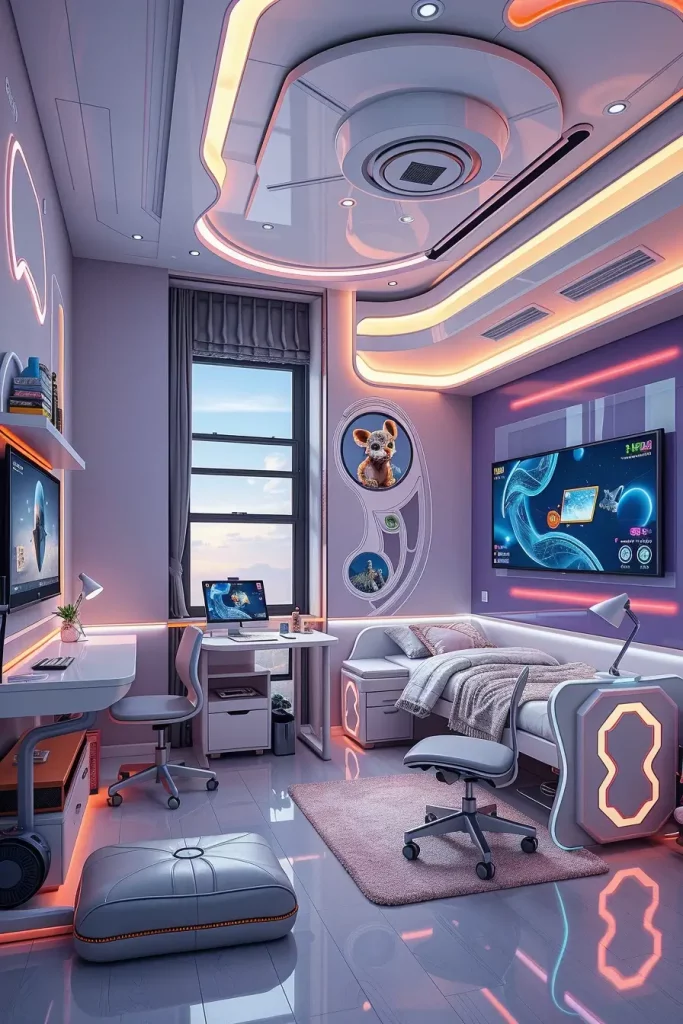 In furnishings, I would recommend such items as adjustable desks to use devices, plug management, and screens attached to the wall to use in learning applications or creative tasks. Another kind of lighting I would install is soft LED lighting that can be turned to study mode or relaxation mode. This gives the environment a balanced, multi-purpose which is able to respond to the various times of day.