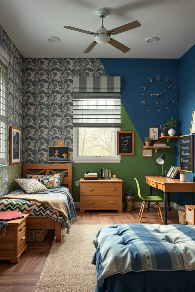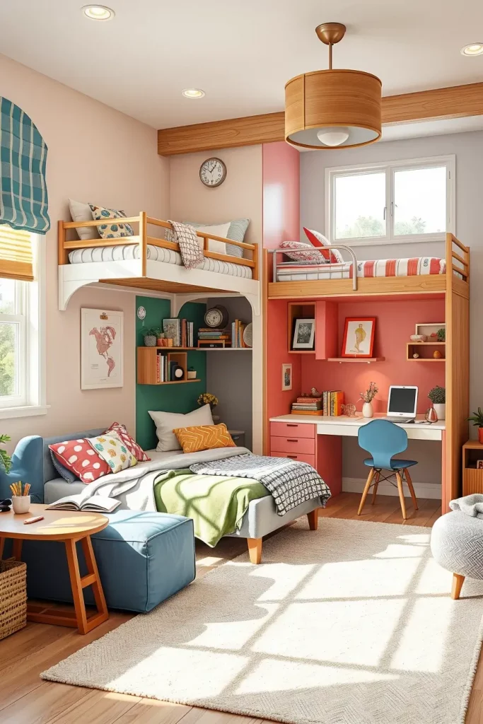 It is common with me to use loft beds or opposite-wall bed arrangement to delineate sleep zones, and study zones could be reflective or arranged parallel to each other. The furniture matches or co-ordination allows in unifying the room but does not go against personal preferences.