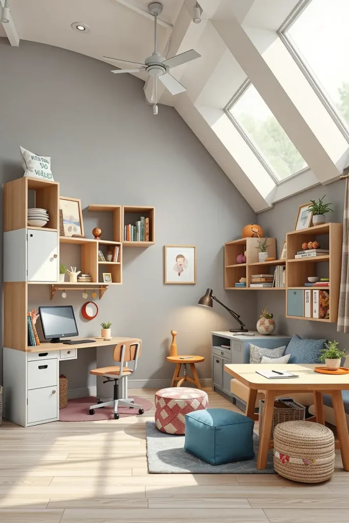 I usually include ergonomic chairs, adjustable chairs, chalkboard or magnetic walls and organized shelves with learning materials. I also incorporate soft task lighting, storage bins and big tables in which hands-on projects can be performed. These features render the area very productive, attractive and multi-purpose to various ages.