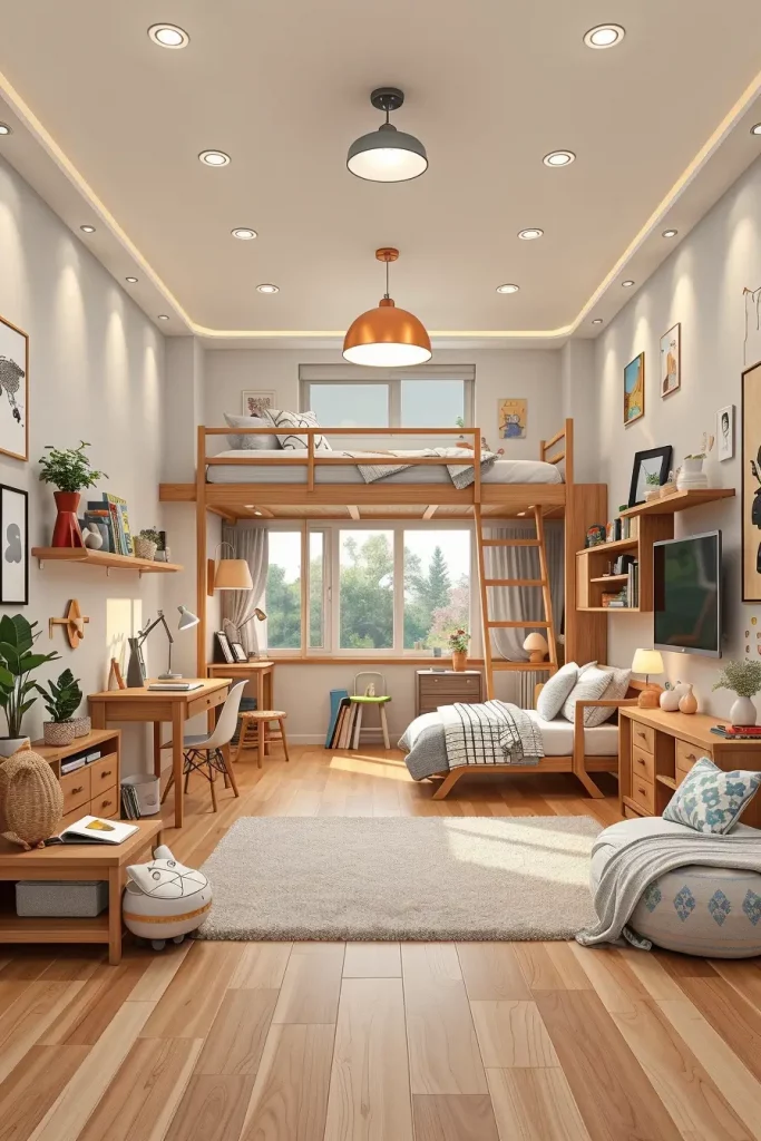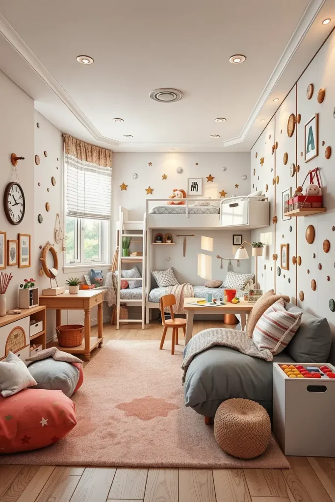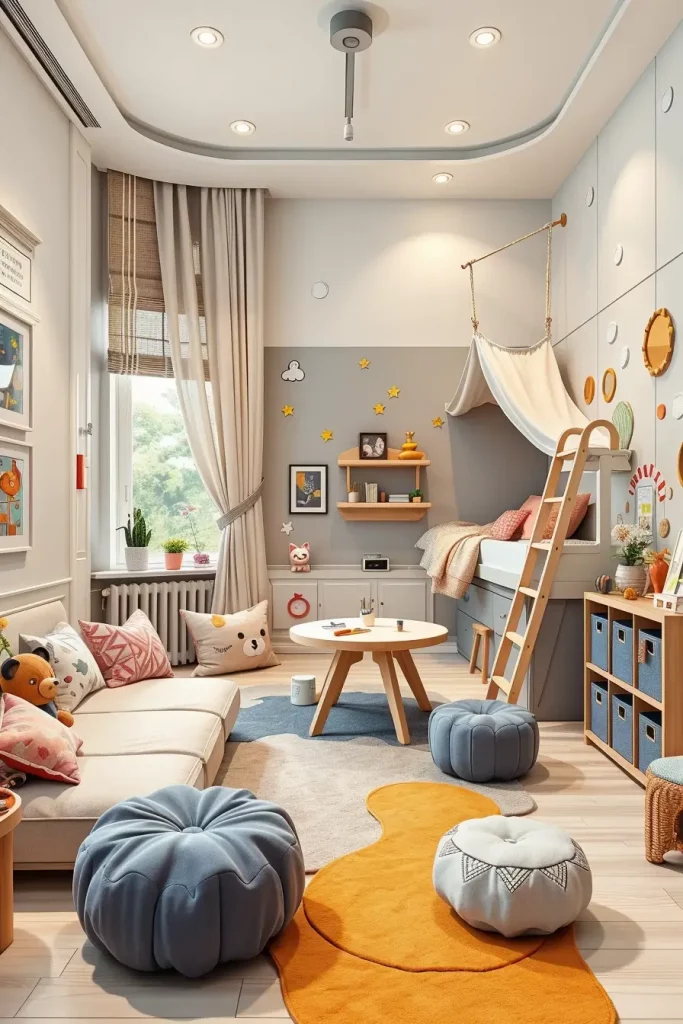 Most of my play furniture typically consists of multifunctional items like climbing ladders that are attached to the frame of the bed, small tables to create art pieces, and modular cushions that can be re-organized to accommodate various activities. Storage bins and open shelves are needed to ensure that the room does not look cluttered, particularly in cases where all the children have a lot of toys or craft materials.