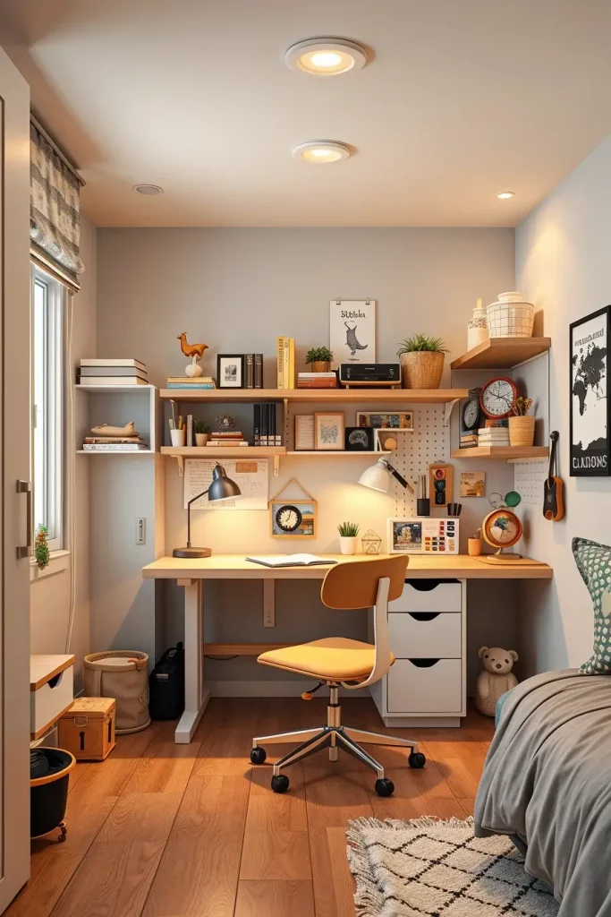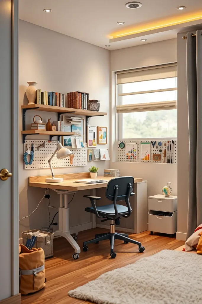 I tend to include adjustable desks, office chairs, and shelves constructed above or next to the desk. Small drawers, pegboards, and magnetic boards are used to organize the supplies and enhance productivity along with the minimization of clutter.